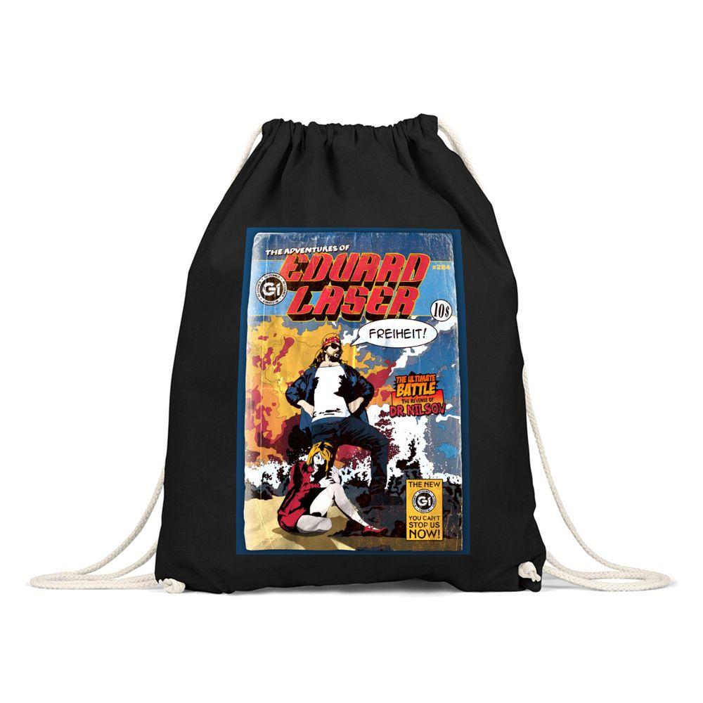 Der schwarze Turnbeutel zeigt ein Comiccover von Eduard Laser.