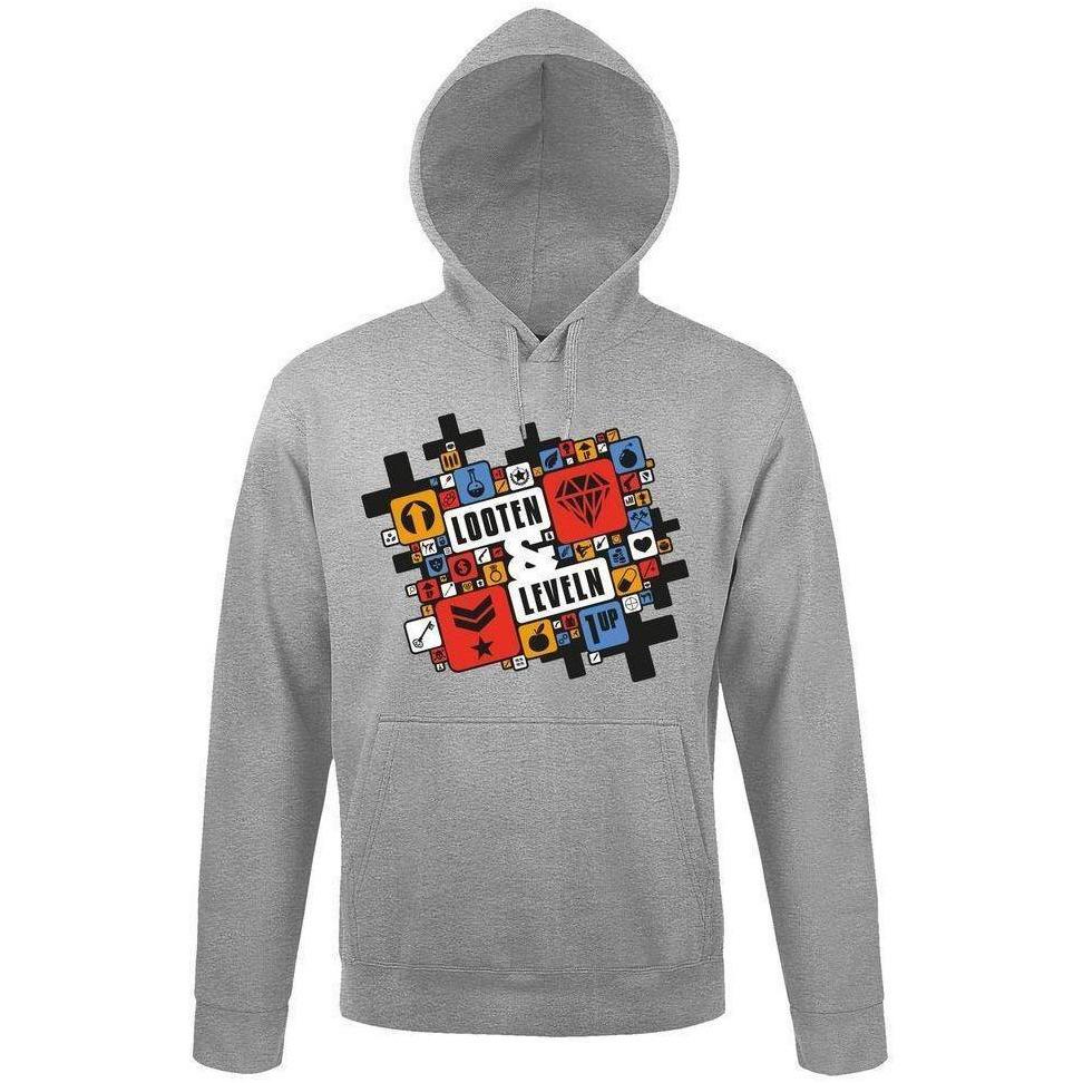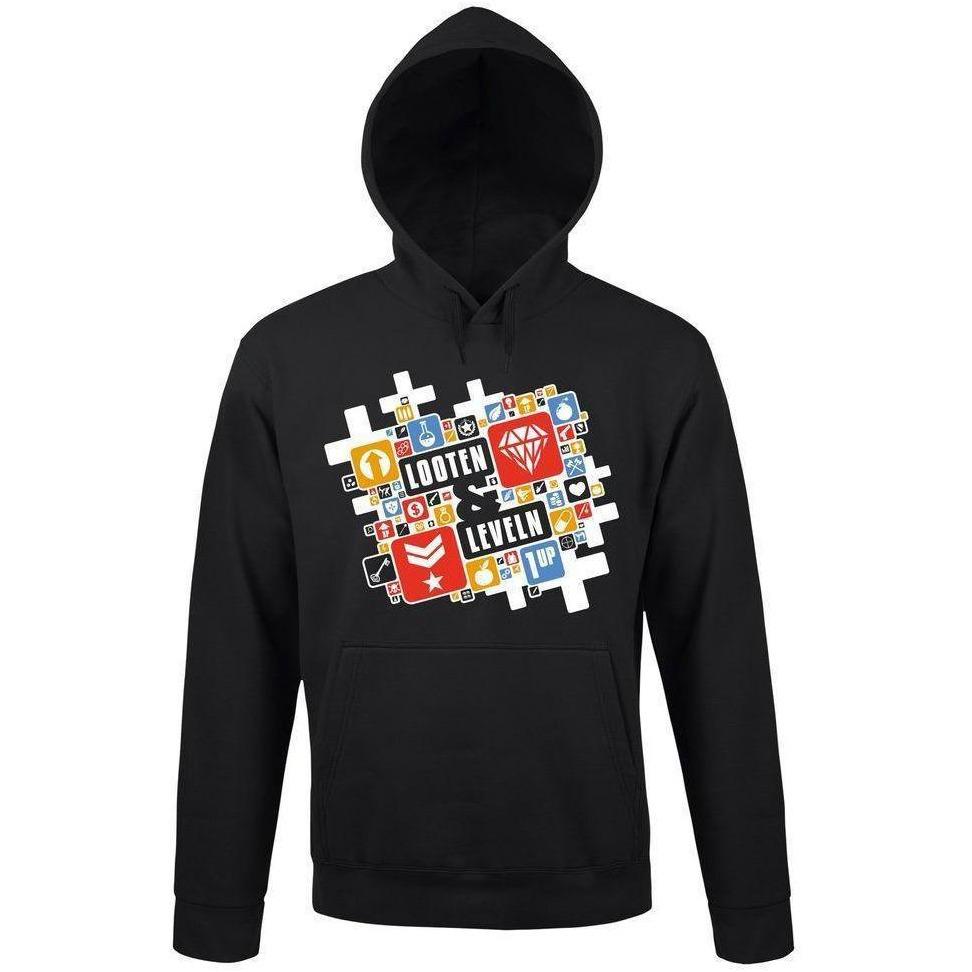 Der Hoodie zeigt die Worte looten & leveln, umrahmt von verschiedenen Symbolen.