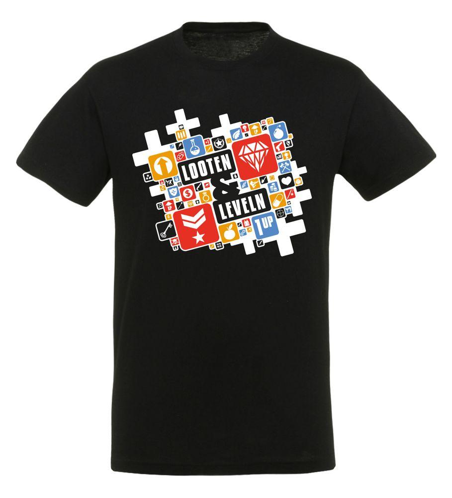 Das T-Shirt zeigt die Worte looten & leveln, umrahmt von verschiedenen Symbolen.