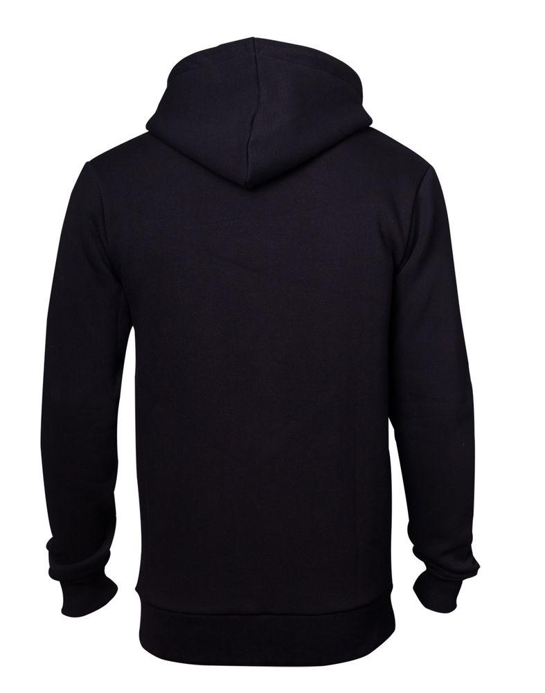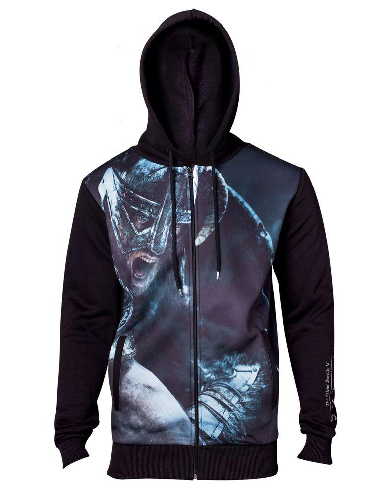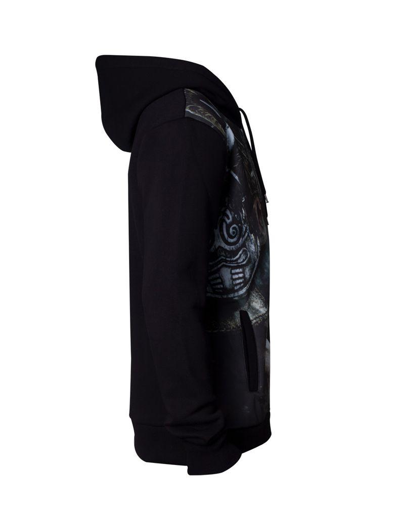 Die schwarze Kapuzenjacke zeigt vorne vollflächig einen Krieger, wie er schreiend in den Kampf zieht.