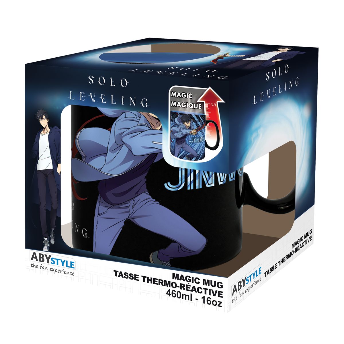 Der Farbwechseltasse zeigt Jinwoo und Igris. Füllt man eine heiße Flüssigkeit ein, erscheint ein farbiger Hintergrund.