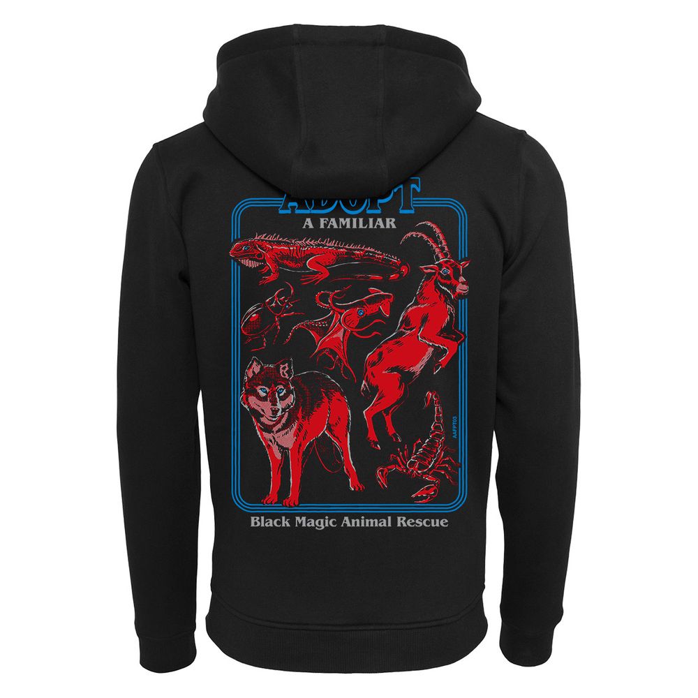 Der Hoodie zeigt verschiedene Tiere, die auf Adoption warten. Darunter steht der Spruch "Black Magic Animal Rescue".