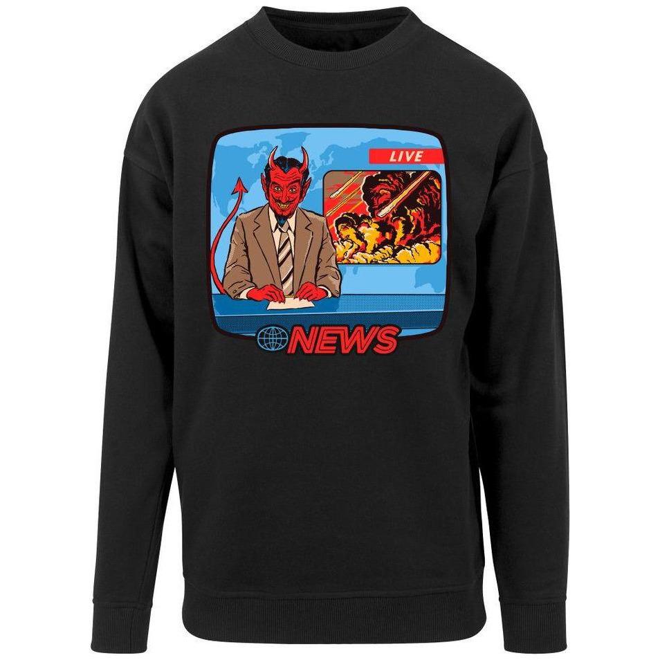 Der Sweater zeigt den Teufel als Nachrichtensprecher, der über die Apokalypse berichtet.