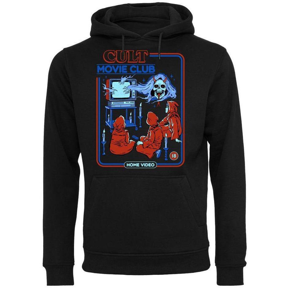 Der Hoodie zeigt drei Kinder, die vor einem Fernseher sitzen, aus dem ein Totenkopf kommt. Oben steht der Text "Cult Movie Club".