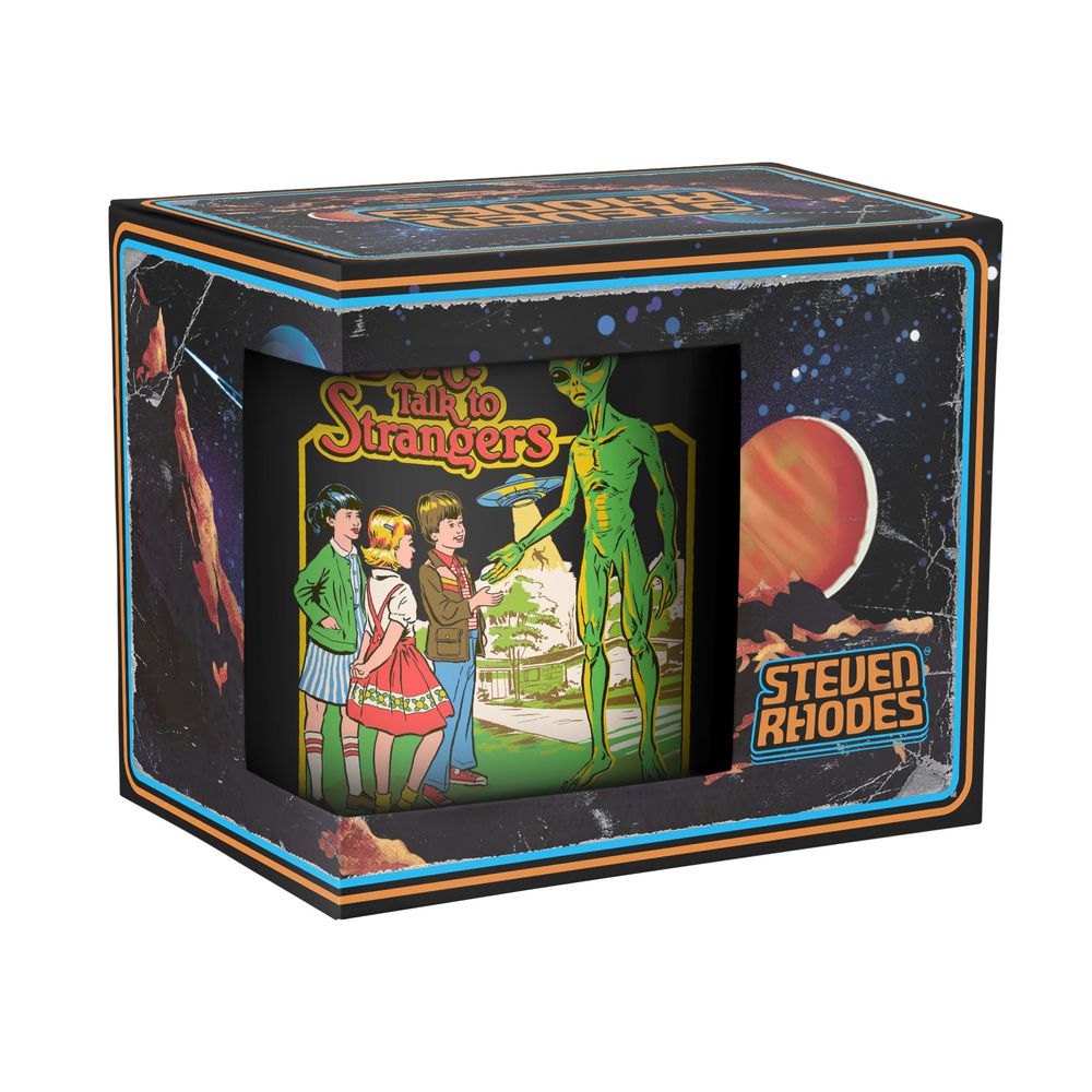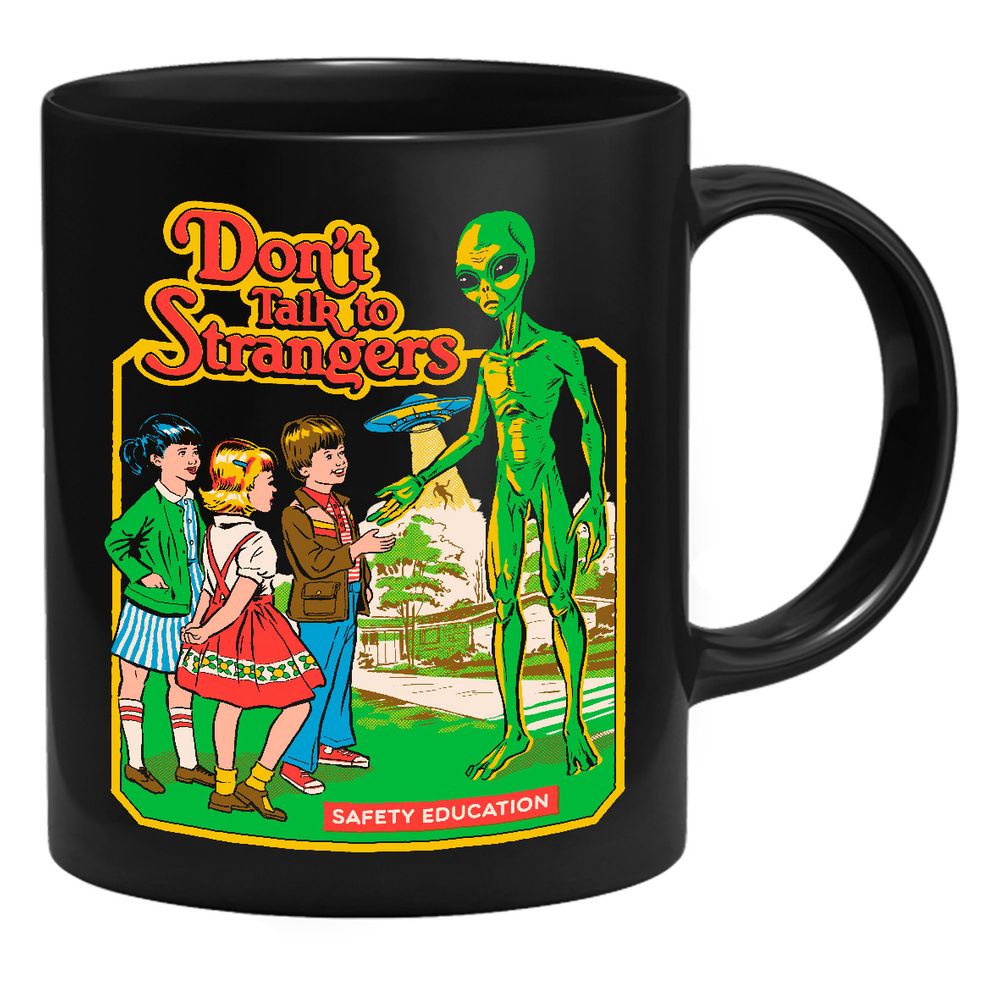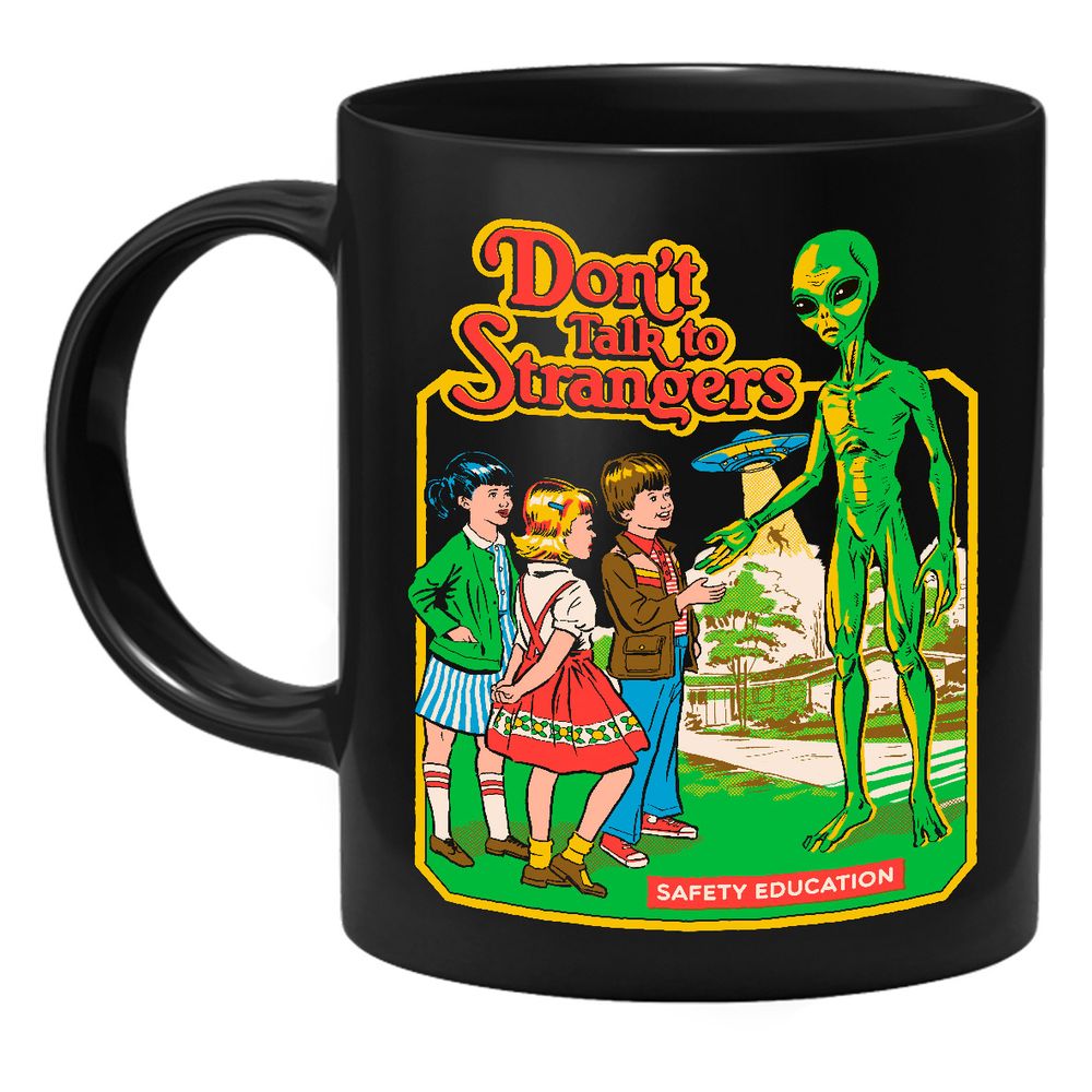 Die Tasse zeigt drei Kinder, die mit einem Alien sprechen. Im Hintergrund erkennt man UFO und den Text "Don’t Talk To Strangers".