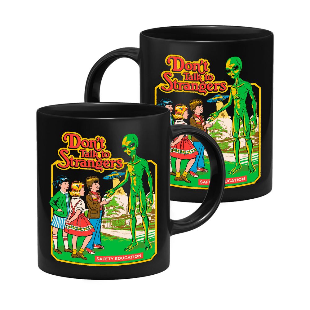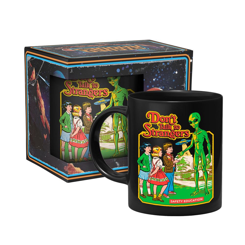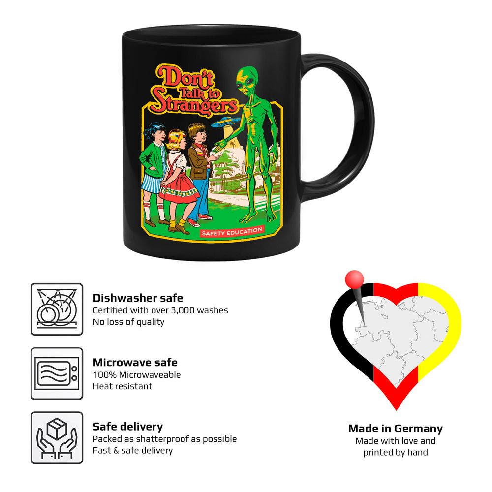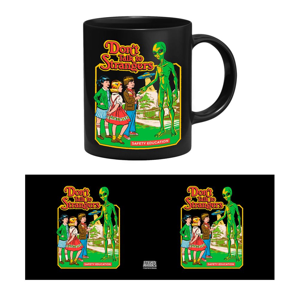 Die Tasse zeigt drei Kinder, die mit einem Alien sprechen. Im Hintergrund erkennt man UFO und den Text "Don’t Talk To Strangers".