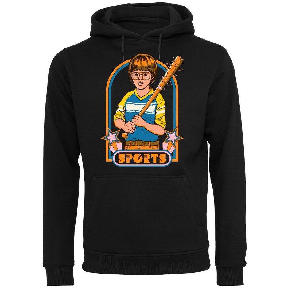 Der Sweater zeigt einen Jungen mit einem Baseballschläger, der mit Nägeln gespickt ist.