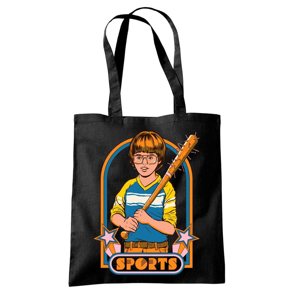 Die Tasche zeigt einen Jungen mit einem Baseballschläger, der mit Nägeln gespickt ist.