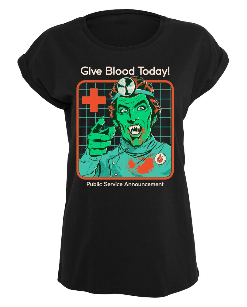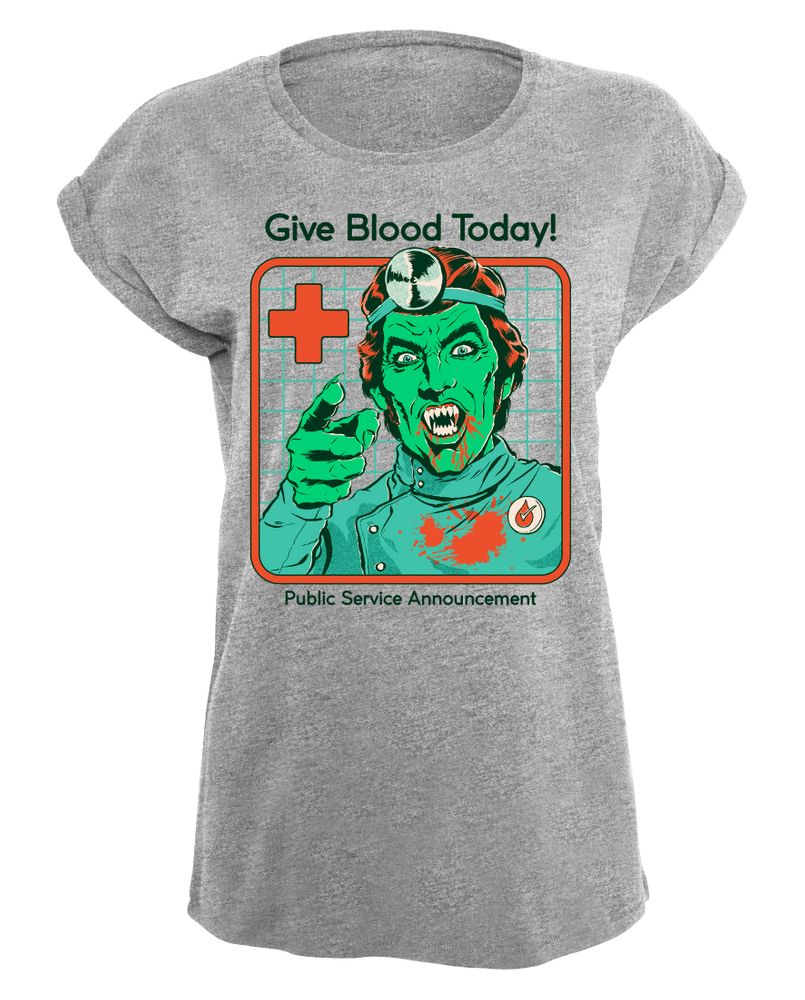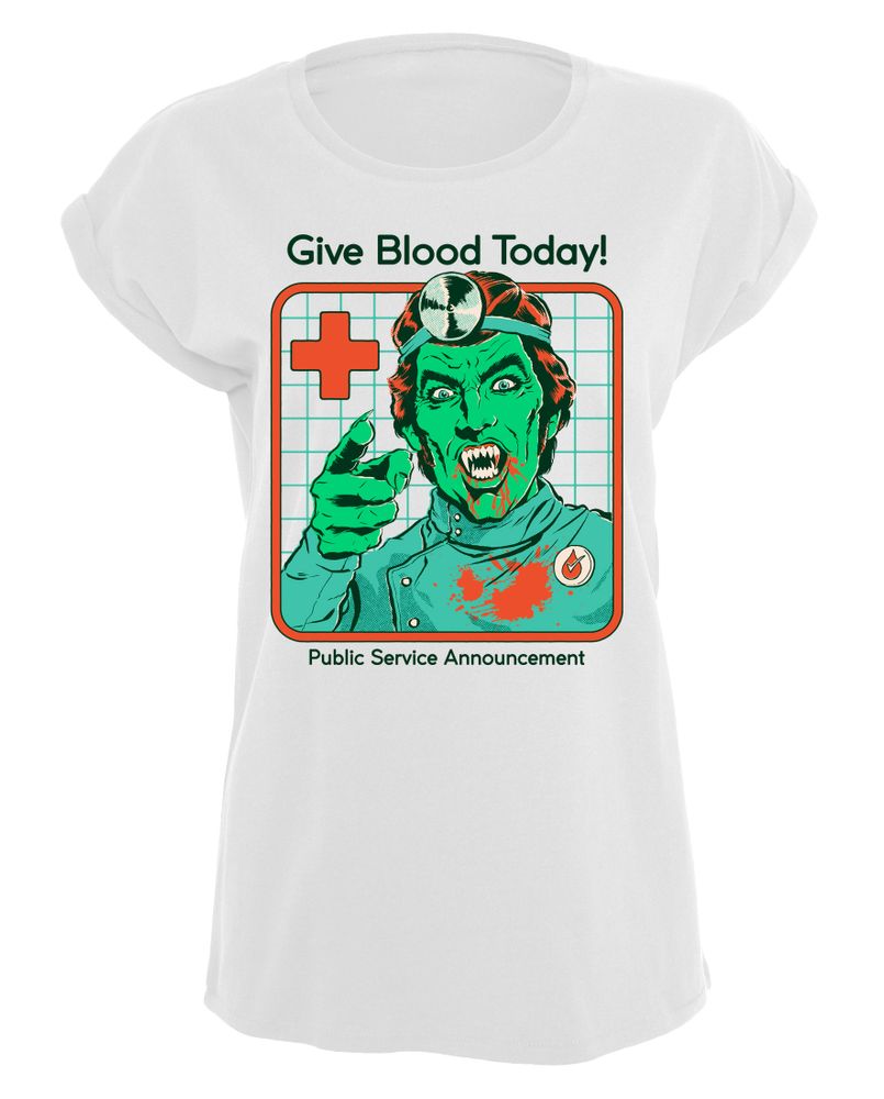 Das T-Shirt zeigt einen Zombie-Arzt, der zum Blutspenden animiert.