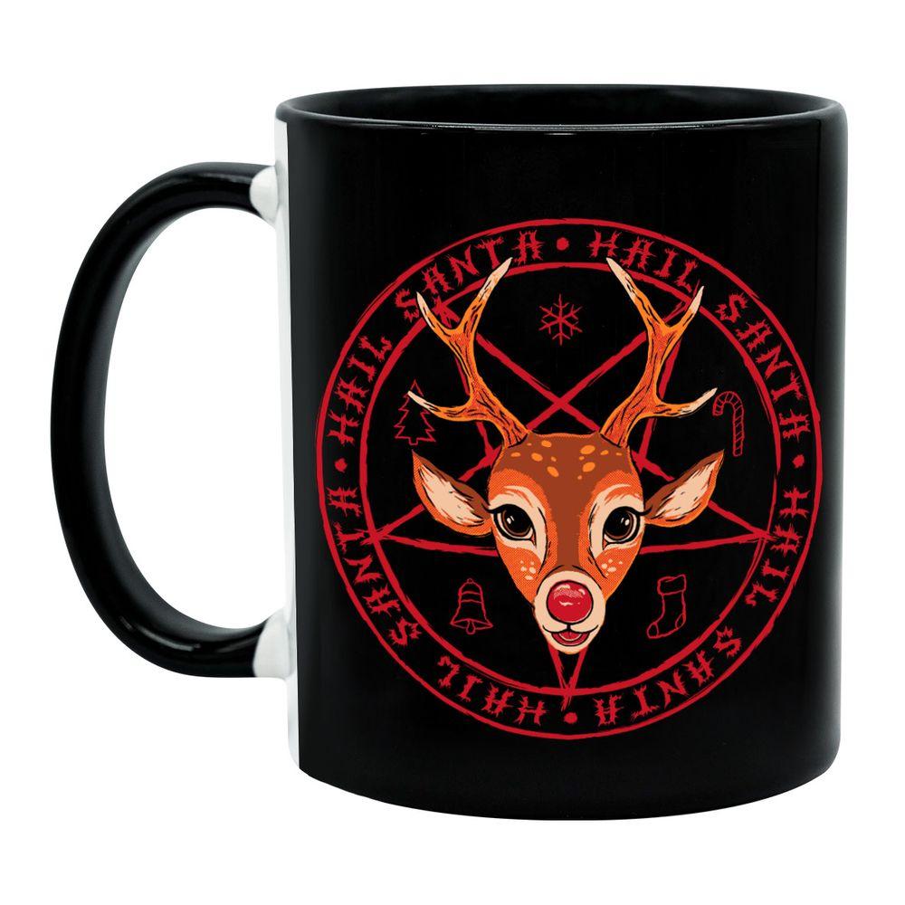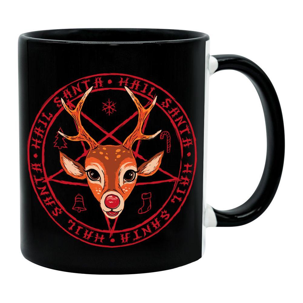 Die Tasse zeigt einen Rentierkopf auf einem Pentagram. Um es herum steht "Hail Santa" in einem Kreis.