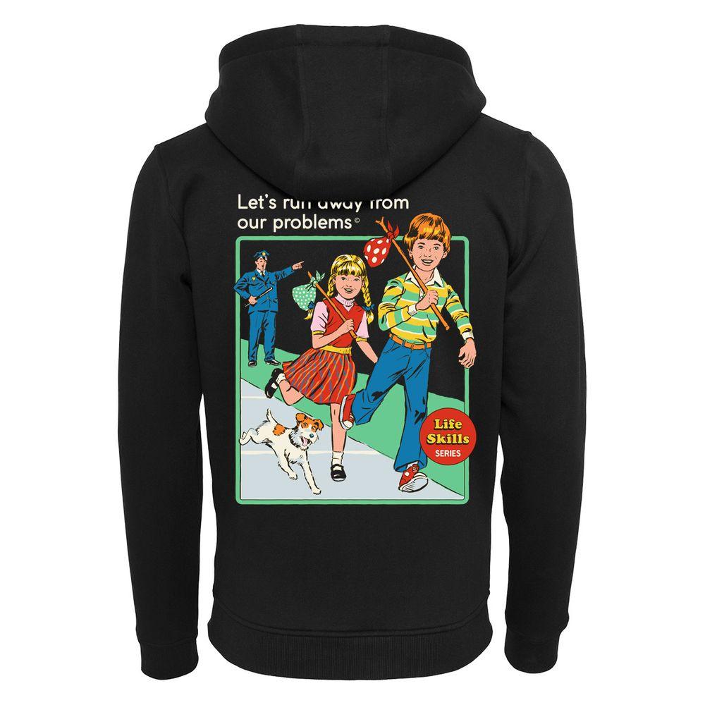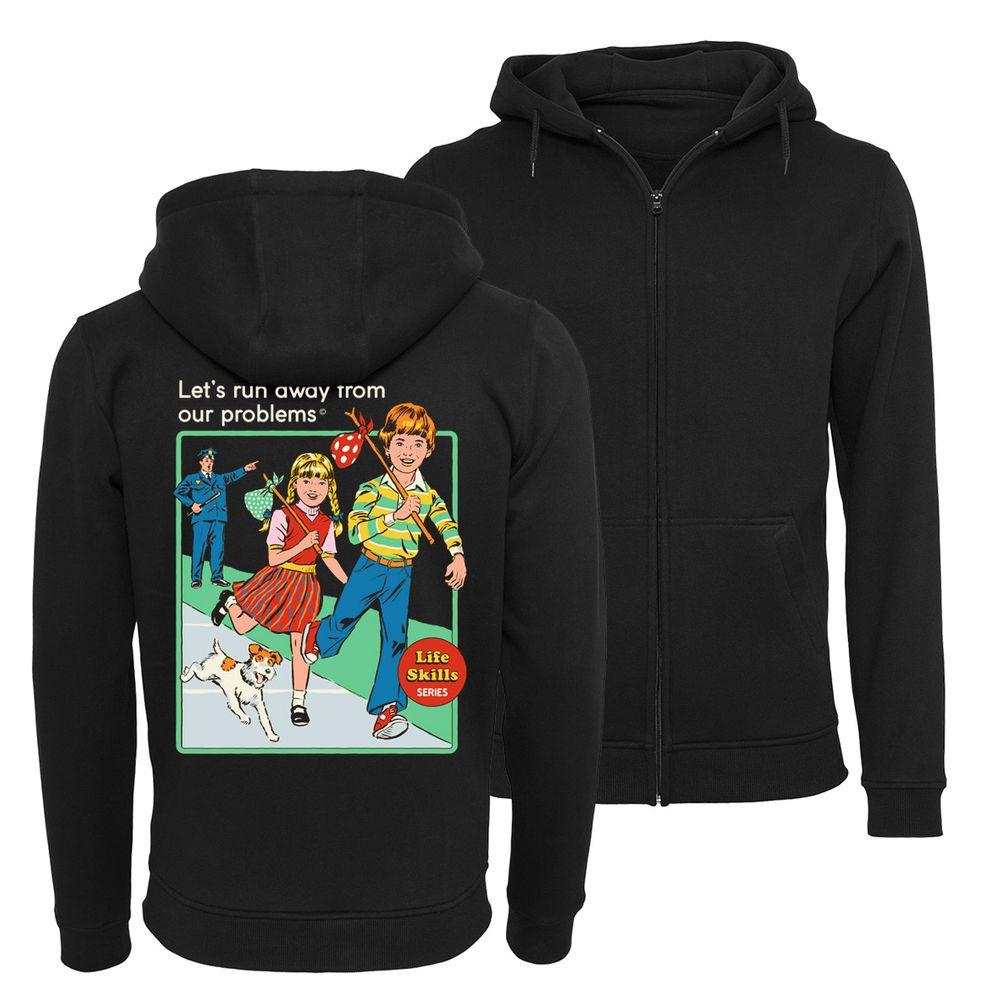 Der Zip-Hoodie zeigt einen Jungen und ein Mädchen, die mit einem Hund vor einem Polizisten weglaufen. Außerdem liest man den Text "Let’s Run Away From Our Problems".