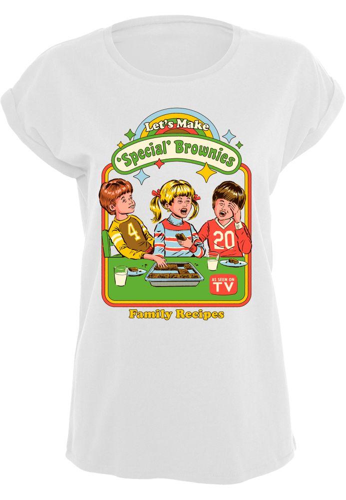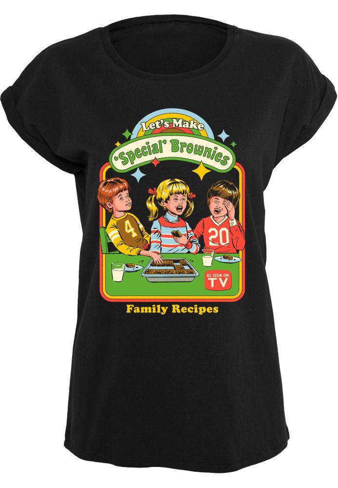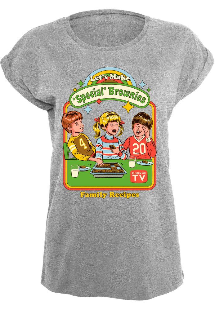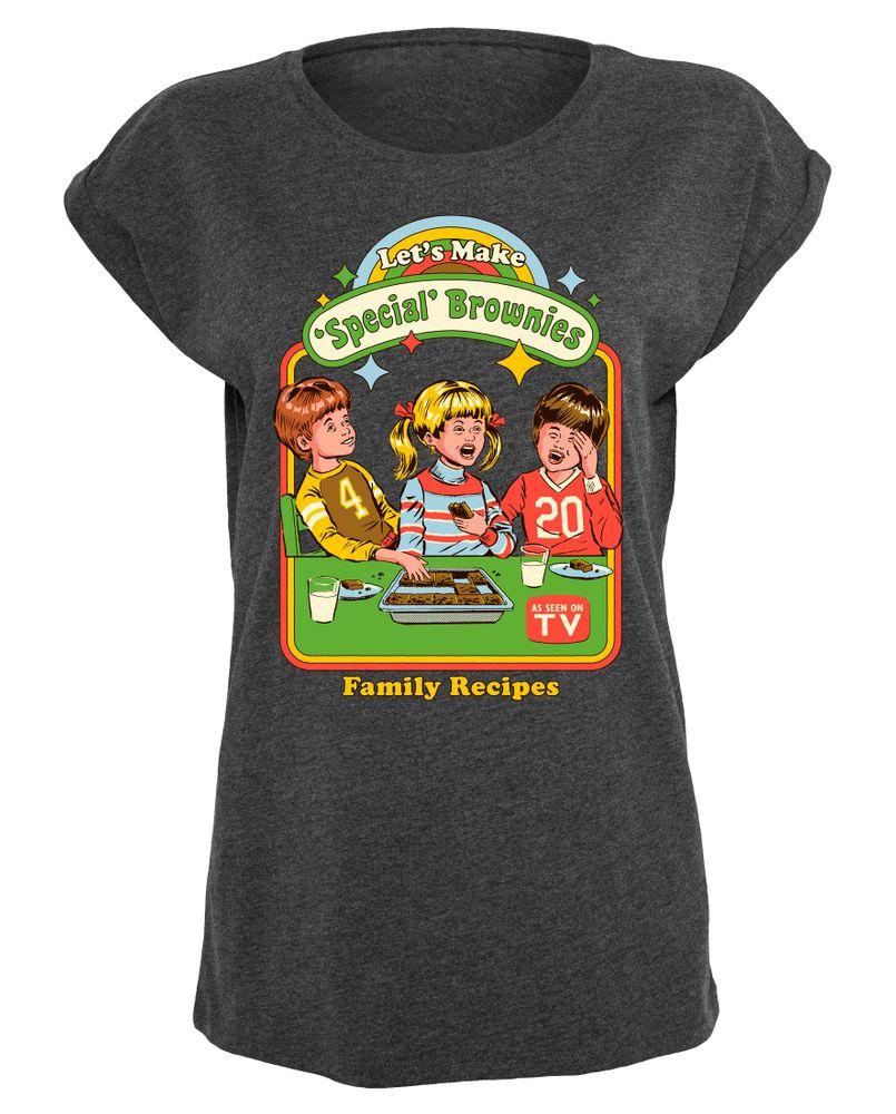 Das Shirt zeigt drei Kinder, die "besondere" Brownies gebacken haben.