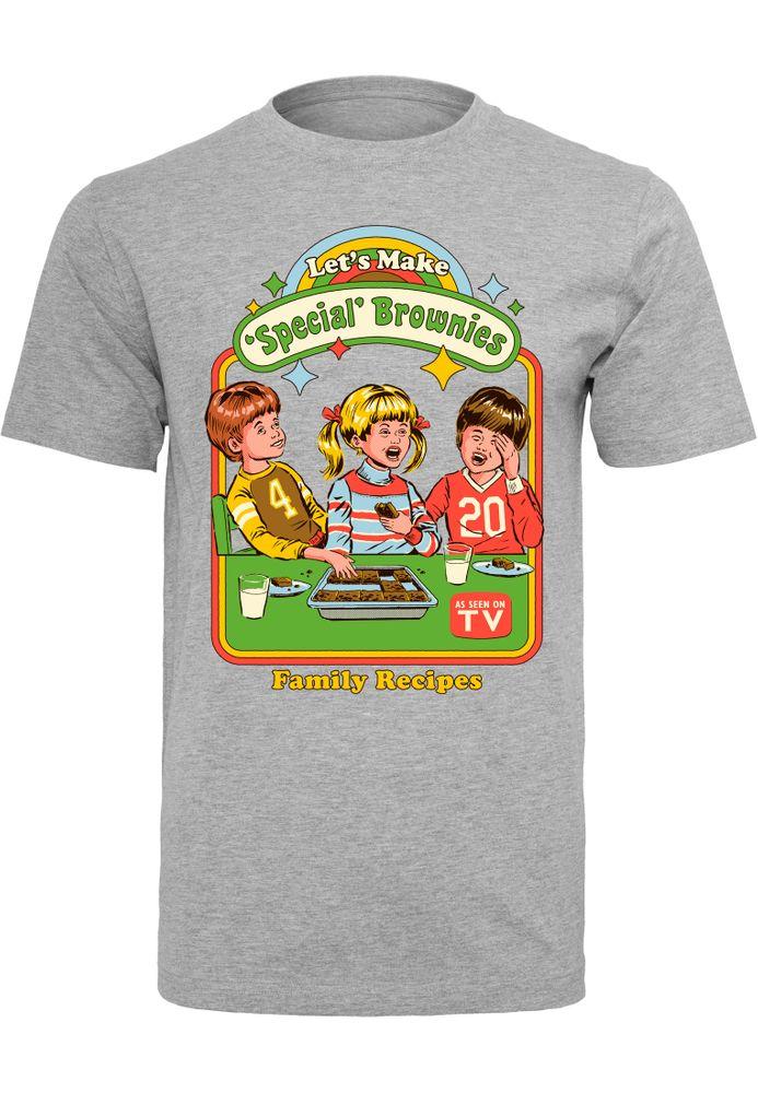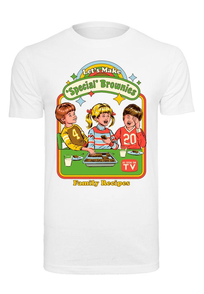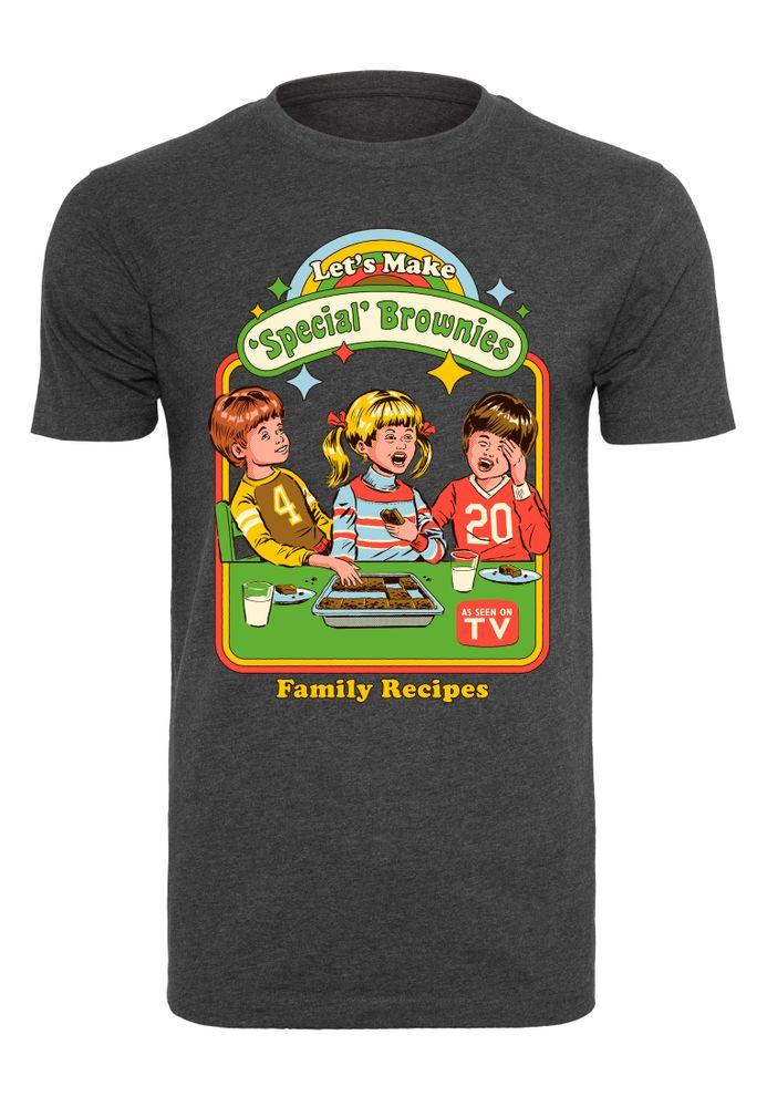 Das T-Shirt zeigt drei Kinder, die "besondere" Brownies gebacken haben.