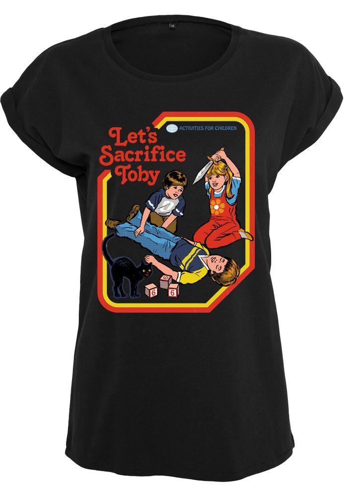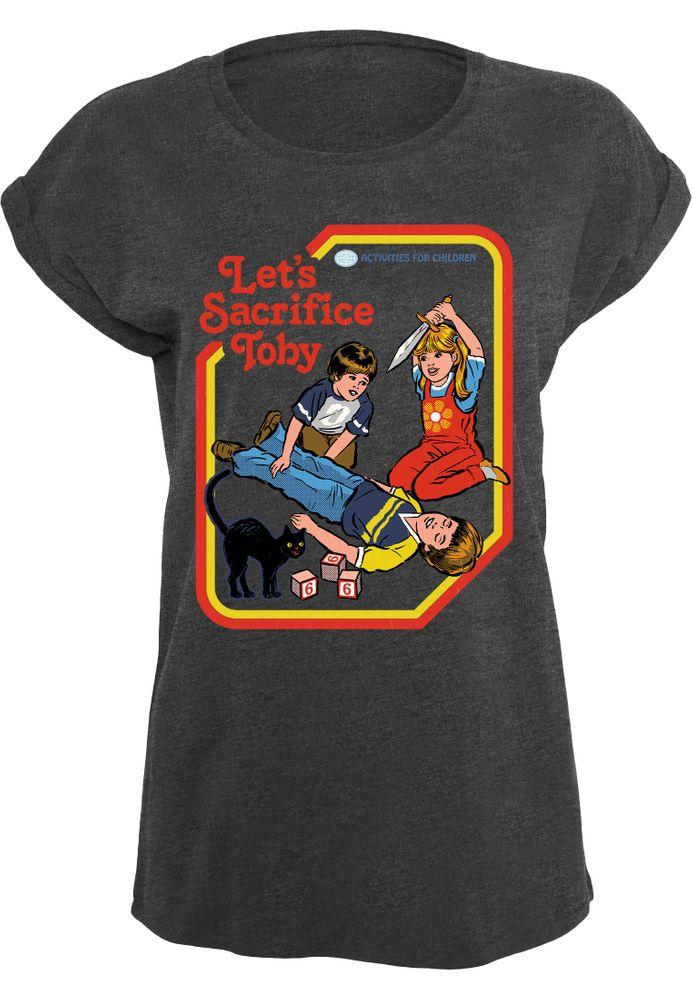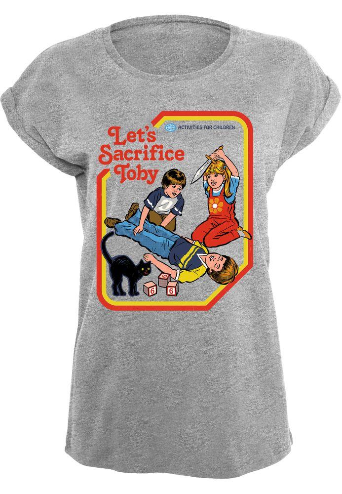 Das Girlshirt zeigt zwei Kinder, die ein anderes Kind namens Toby opfern wollen und den Text "Let's Sacrifice Toby".