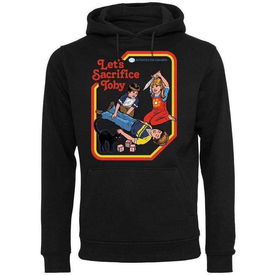 Der Hoodie zeigt zwei Kinder, die ein anderes Kind namens Toby opfern wollen und den Text "Let's Sacrifice Toby".