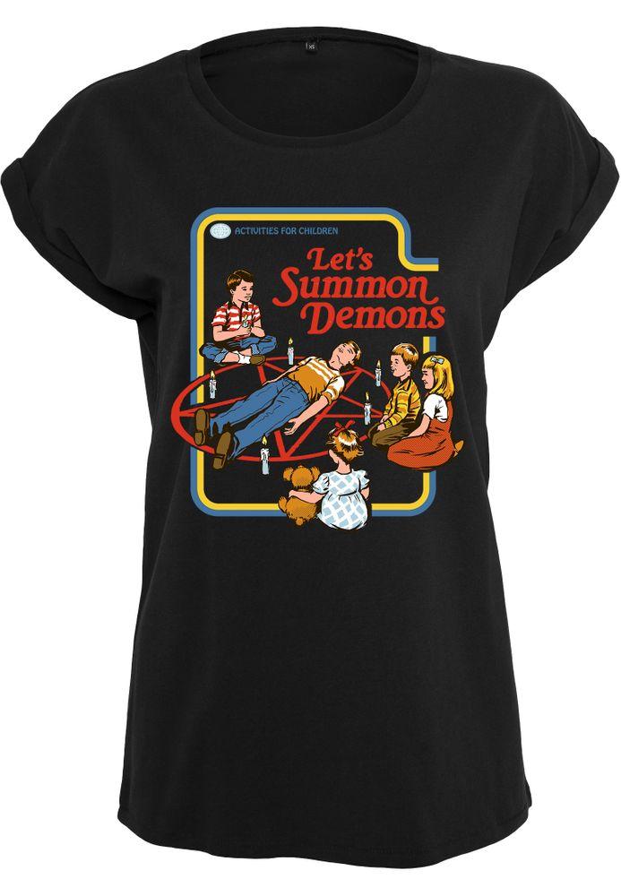 Das Girlshirt zeigt Kinder, die mit Hilfe eines Pentagrams einen Dämon beschwören wollen und den Text "Let's Summon Demons".