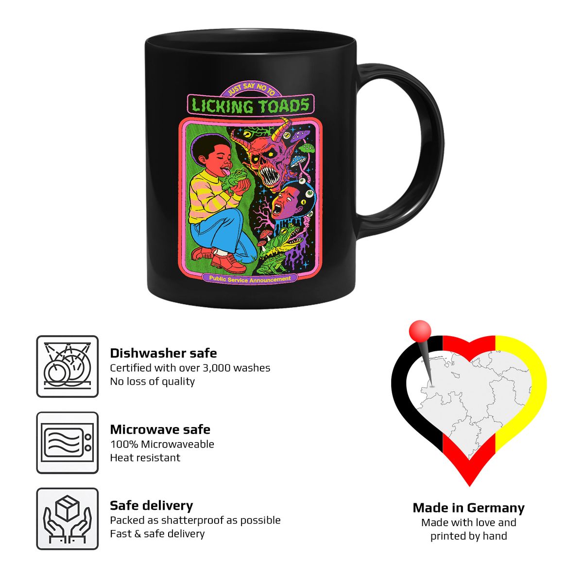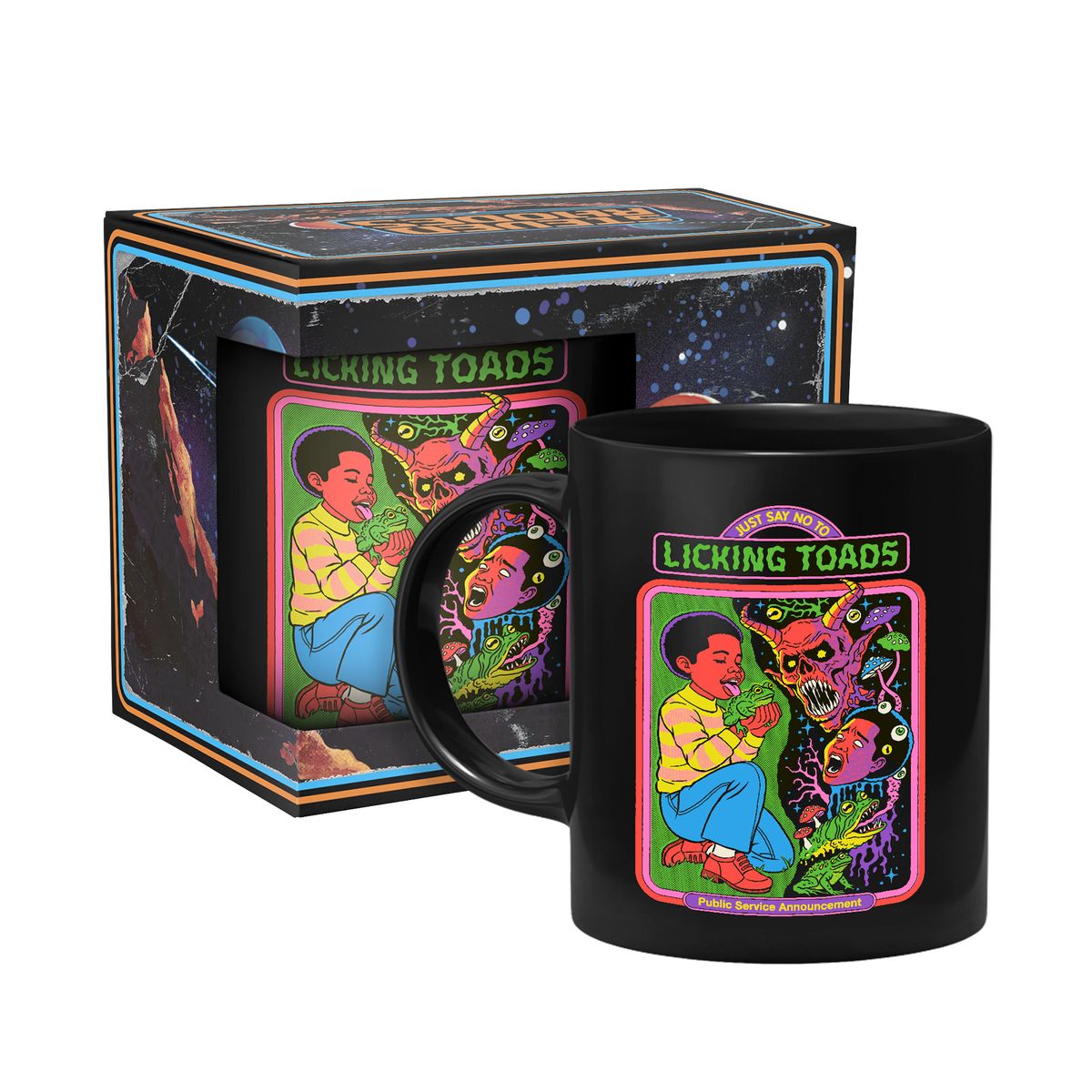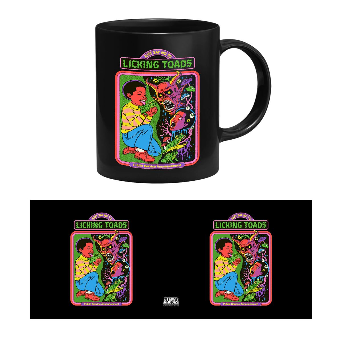 Die Tasse zeigt einen Jungen, der an einer Kröte leckt.