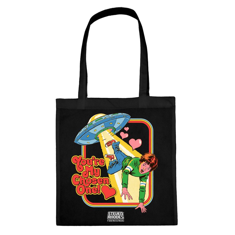Die Tasche zeigt einen Jungen, der von einem UFO eingezogen wird. Dazu sieht man Herzen und den Satz "You’re My Chosen One!“.