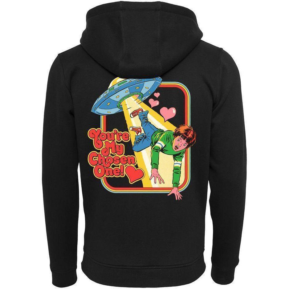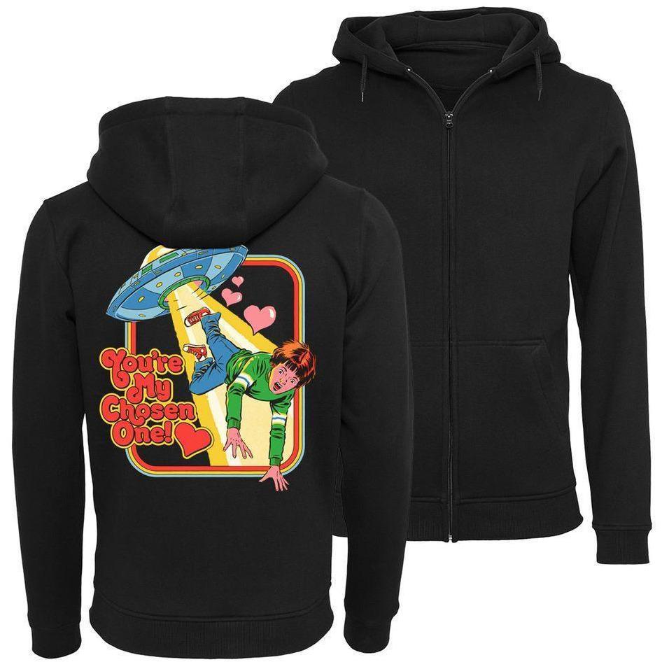 Der Zip-Hoodie zeigt einen Jungen, der von einem UFO eingezogen wird. Dazu sieht man Herzen und den Satz "You’re My Chosen One!“.