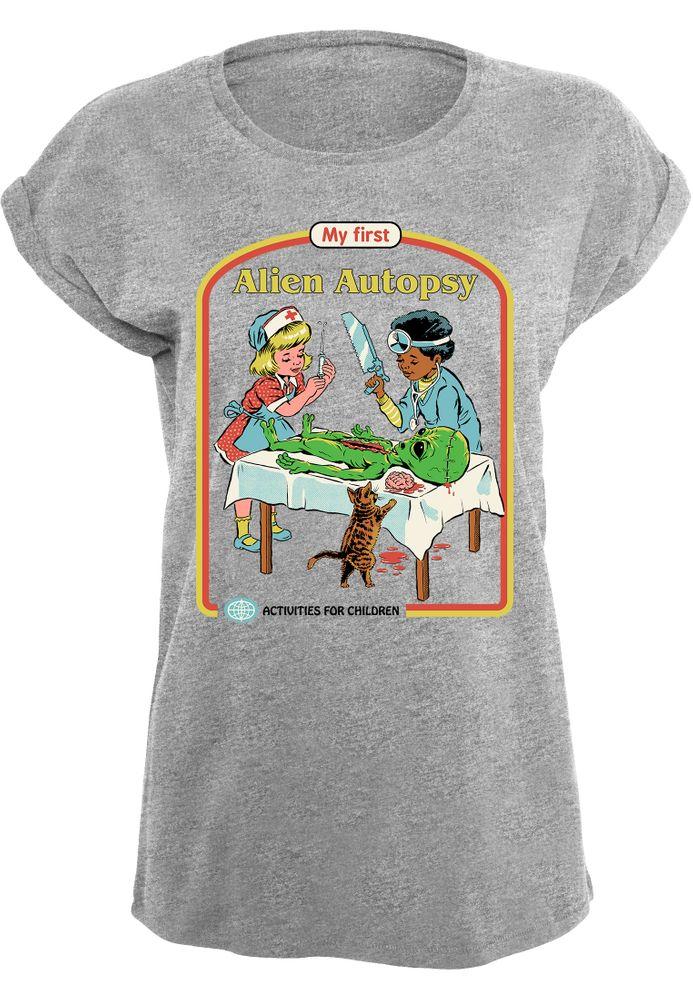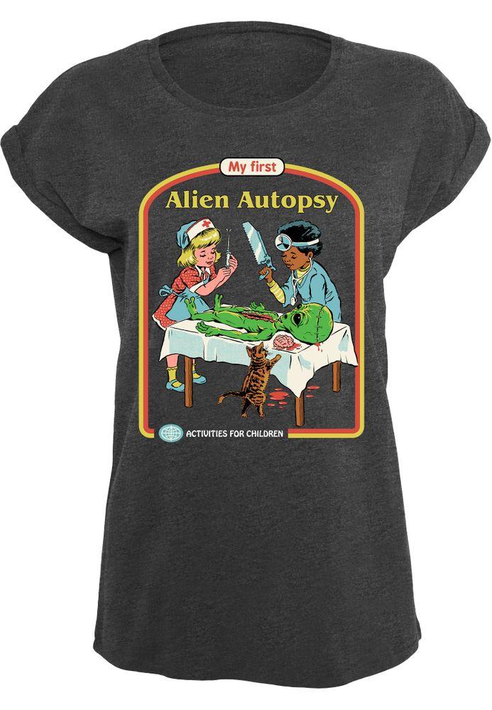 Das Girlshirt zeigt zwei Kinder, die ein Alien obduzieren. Oben steht der Text "My first Alien Autopsy".