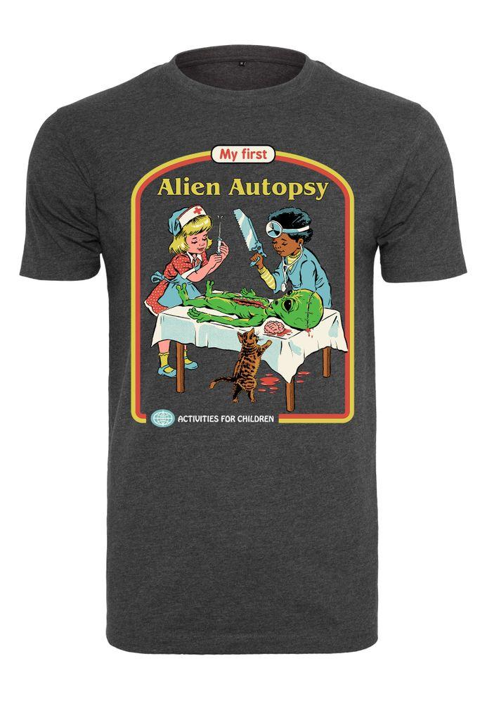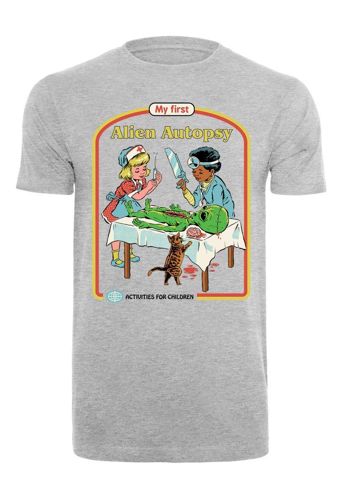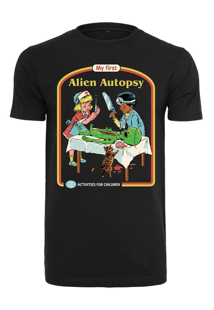 Das T-Shirt zeigt zwei Kinder, die ein Alien obduzieren. Oben steht der Text "My first Alien Autopsy".