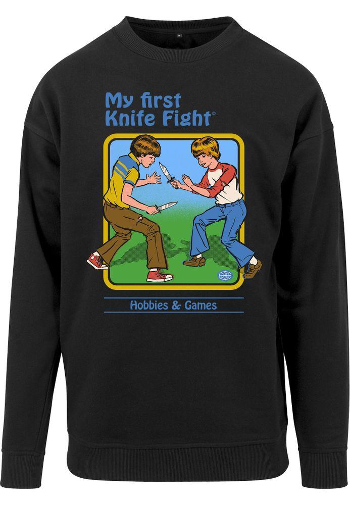 Der Sweater zeigt zwei Jungen, die einen Messerkampf abhalten und den Text "My First Knife Fight".