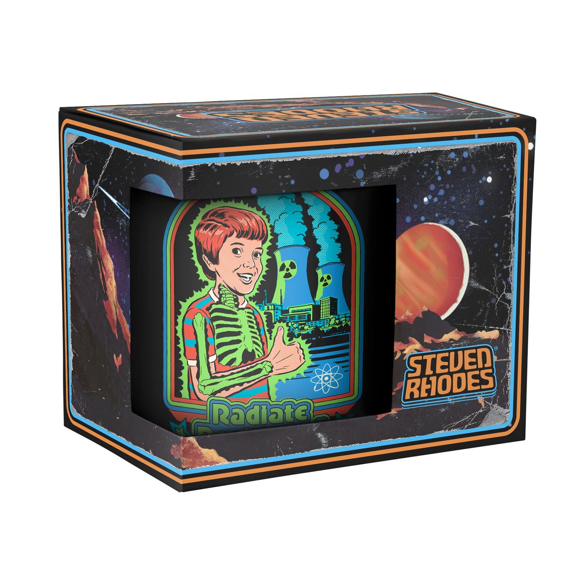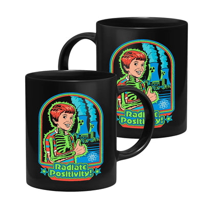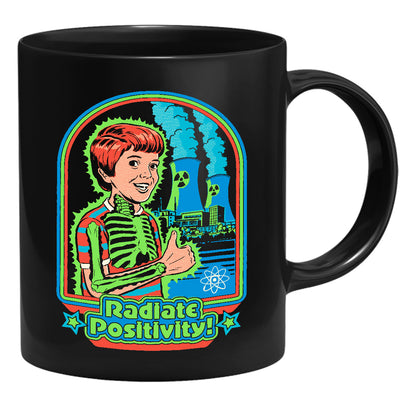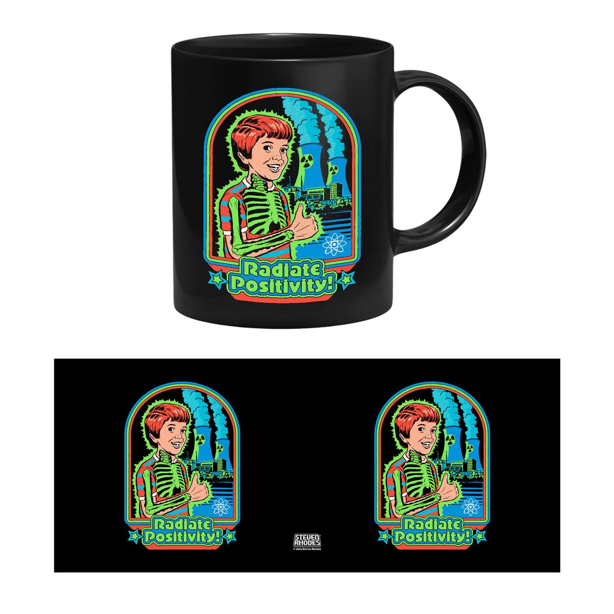 Die Tasse zeigt einen strahlenden Jungen vor einem Atomkraftwerk.