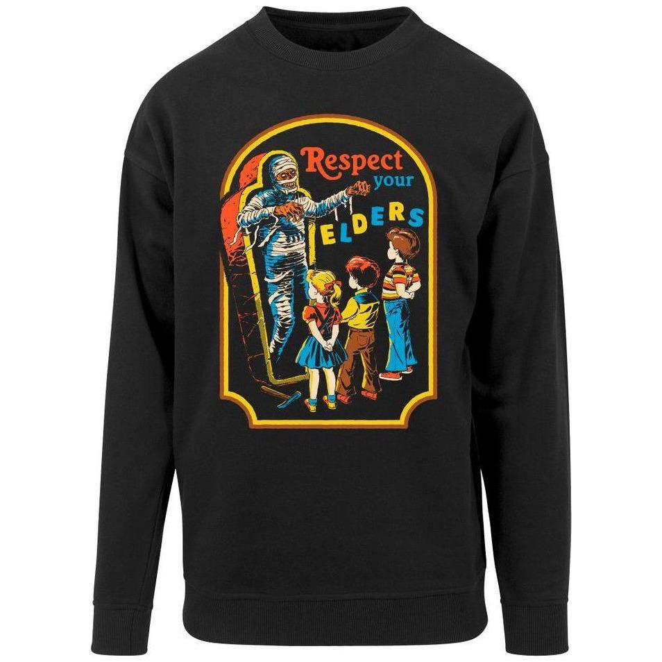 Der Sweater zeigt drei Kinder vor einem Sarg, aus dem gerade eine Mumie kommt.