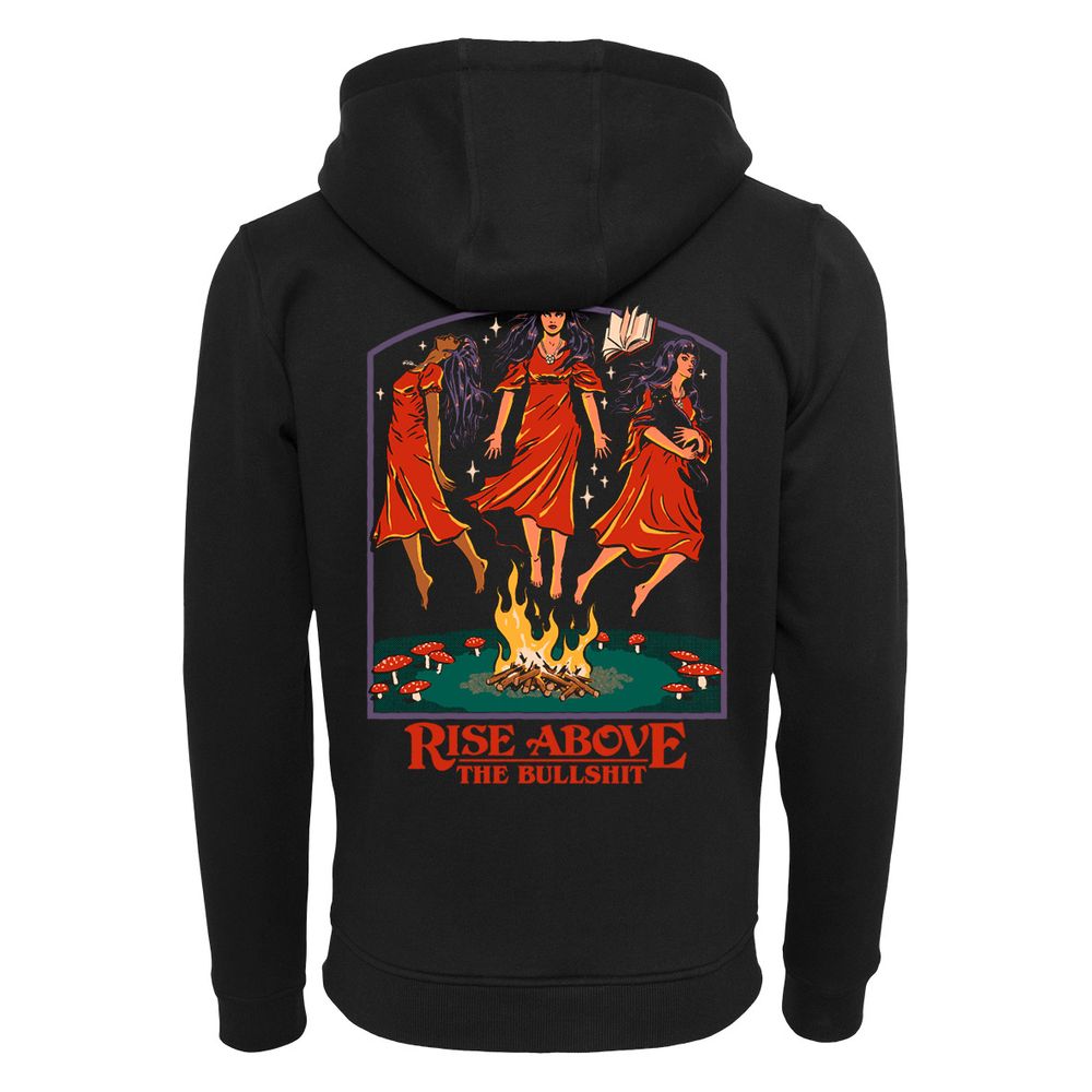 Der Hoodie zeigt drei Frauen, die über einem Feuer schweben.