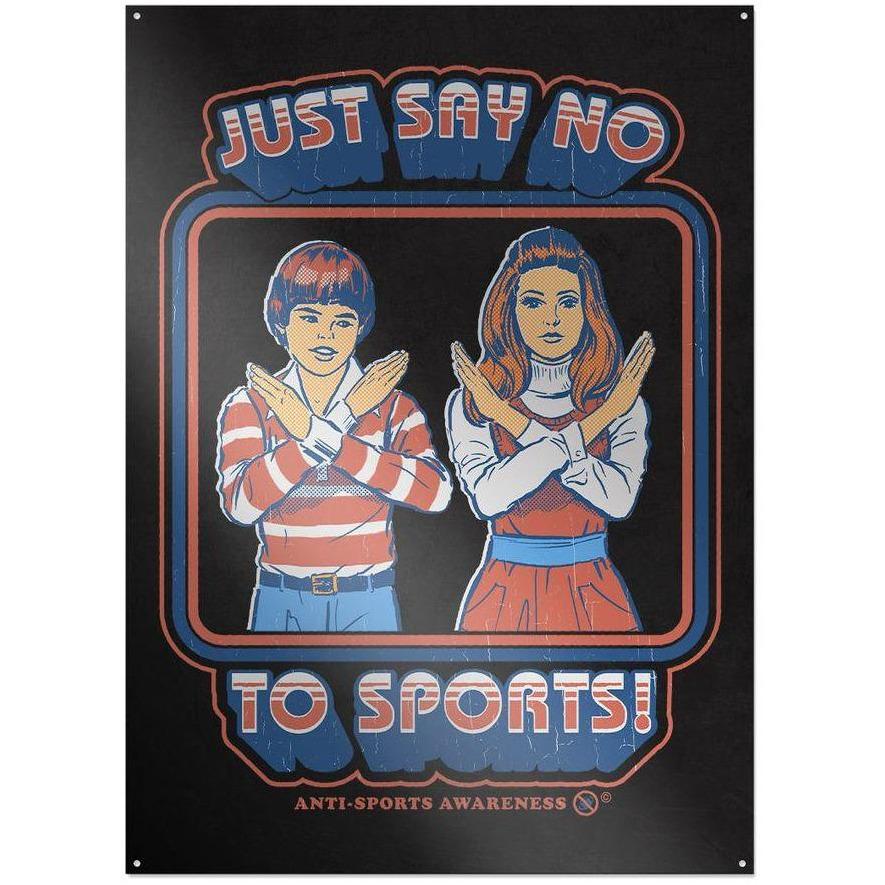 Das Metallschild zeigt einen Jungen und ein Mädchen, die signalisieren, dass sie keine Lust auf Sport haben und den Text "Just Say No To Sports".
