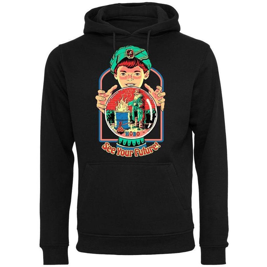 Der Hoodie zeigt einen Jungen, der in einer Kristallkugel einen Mann vor einer Feuertonne stehen sieht. Unten steht der Text "See Your Future".