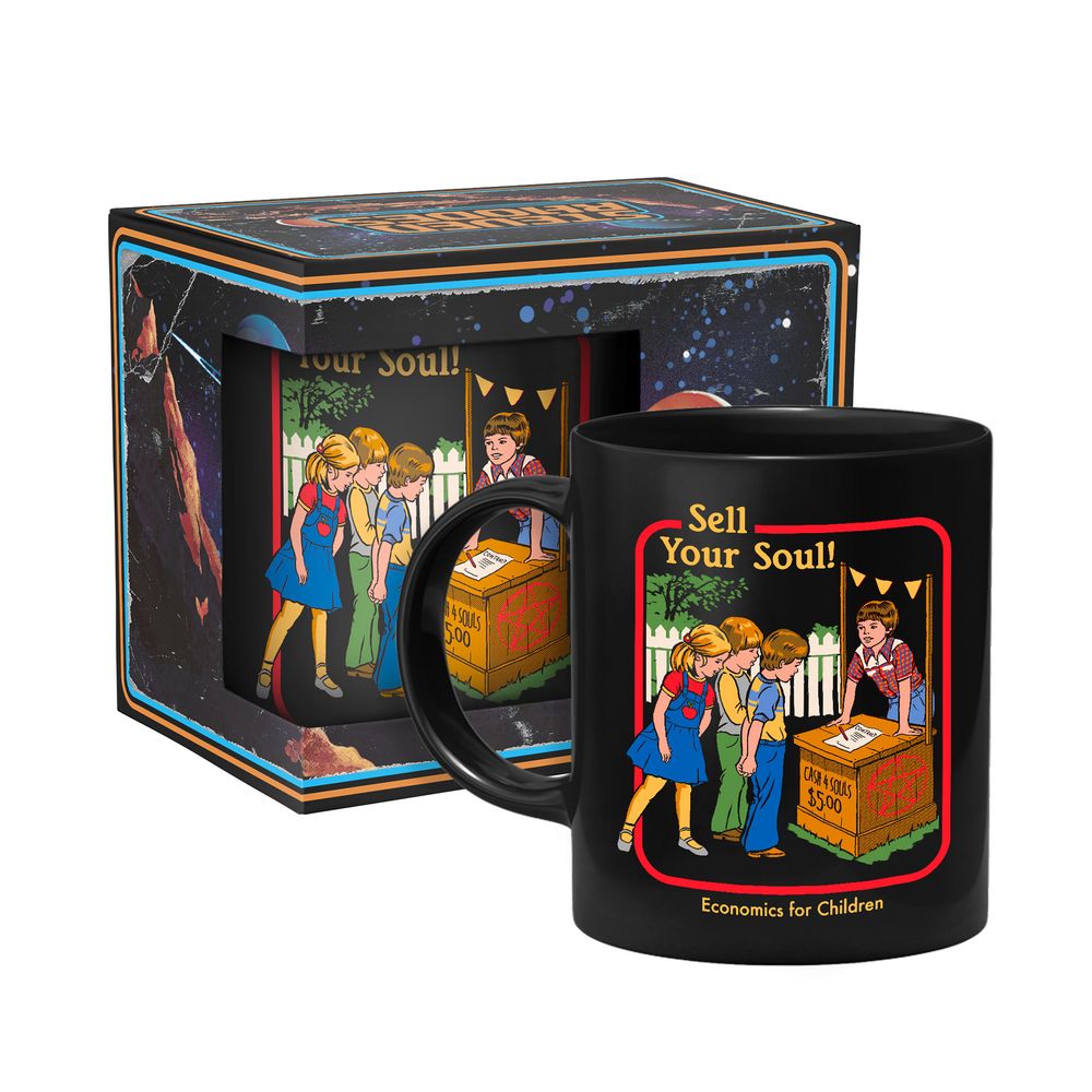 Die Tasse zeigt drei Kinder, die an einem Stand ihre Seele für 5 Dollar verkaufen wollen. Unter dem Bild steht "Economics for Children".