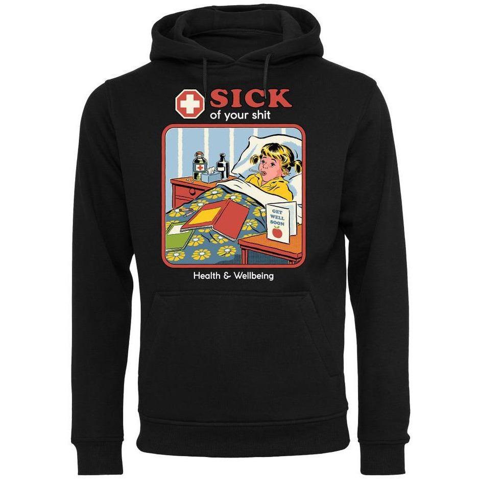 Der Hoodie zeigt ein krankes Mädchen mit einem Fieberthermometer im Mund. In den Details erkennt man Medizin. Ober steht der Text "Sick of your shit".
