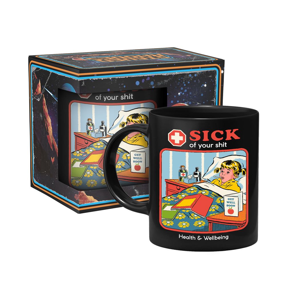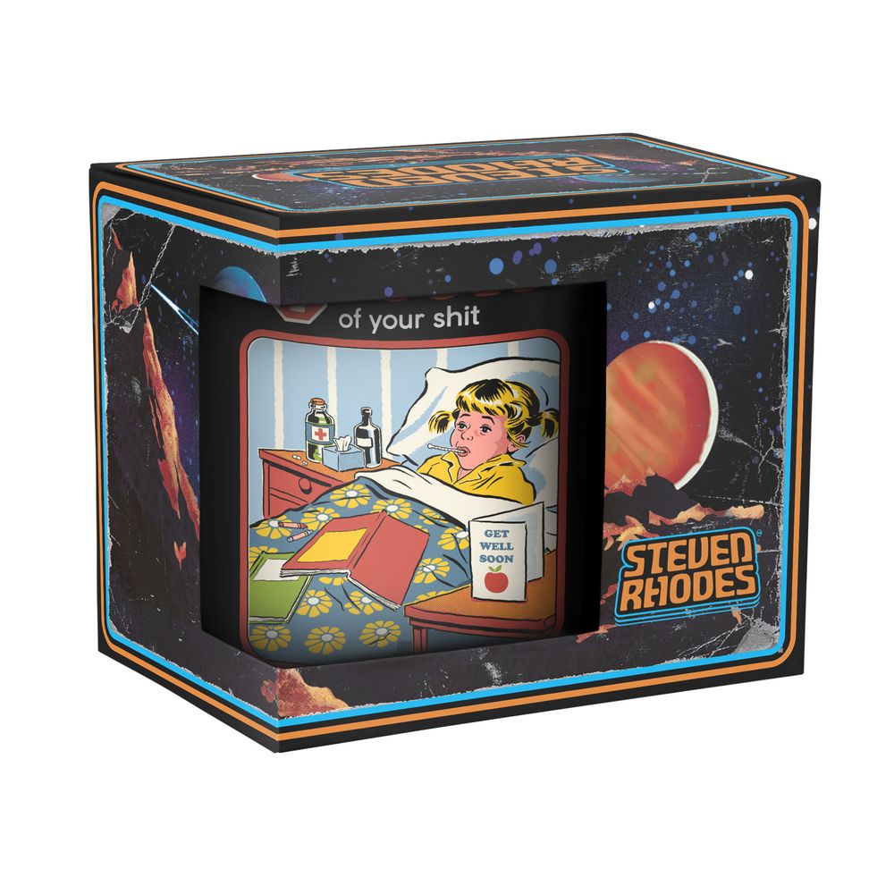 Die Tasse zeigt ein krankes Mädchen mit einem Fieberthermometer im Mund. In den Details erkennt man Medizin. Ober steht der Text "Sick of your shit".