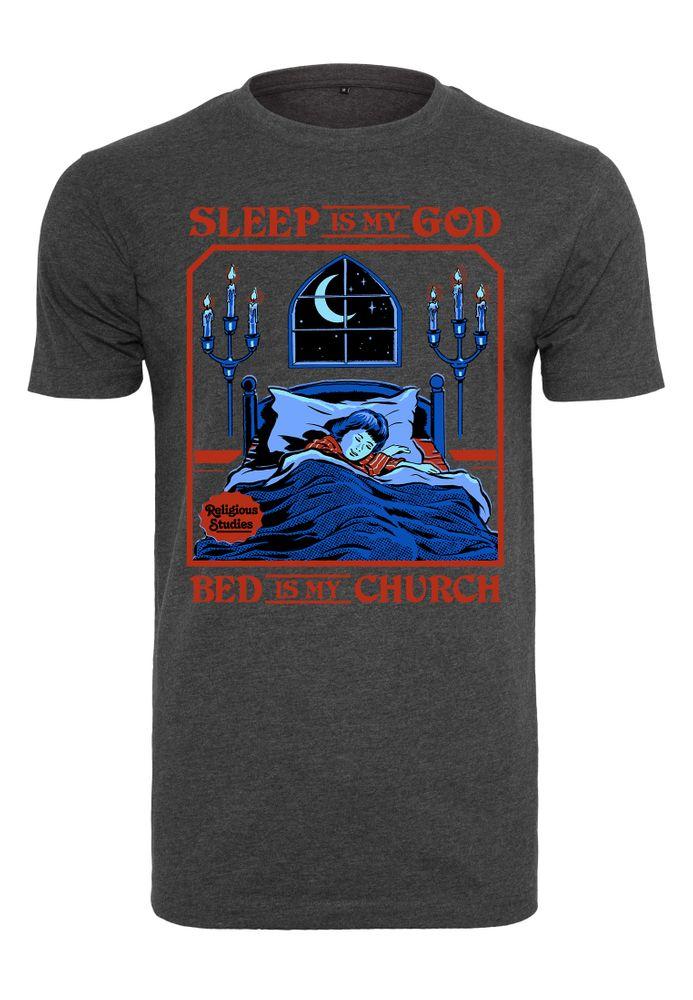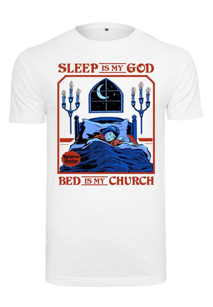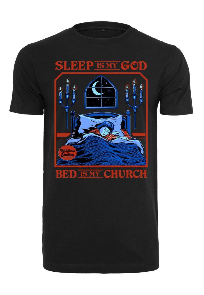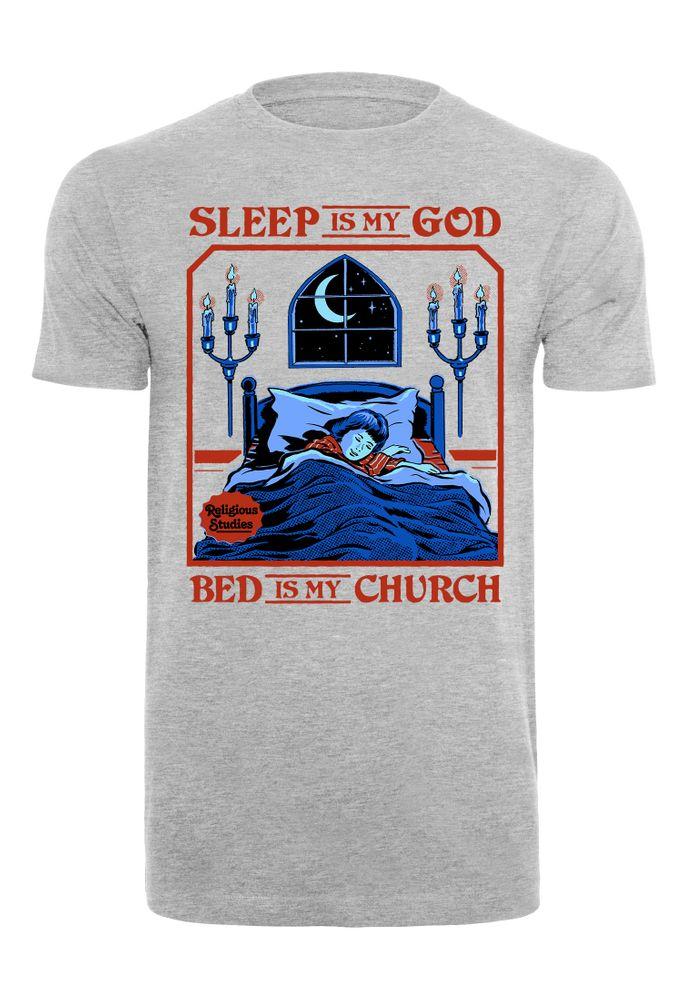 Das T-Shirt zeigt ein schlafendes Kind, das von zwei Kerzenleuchtern umgeben ist. Zu lesen sind die Texte "Sleep Is My God" und "Bed Is My Church".