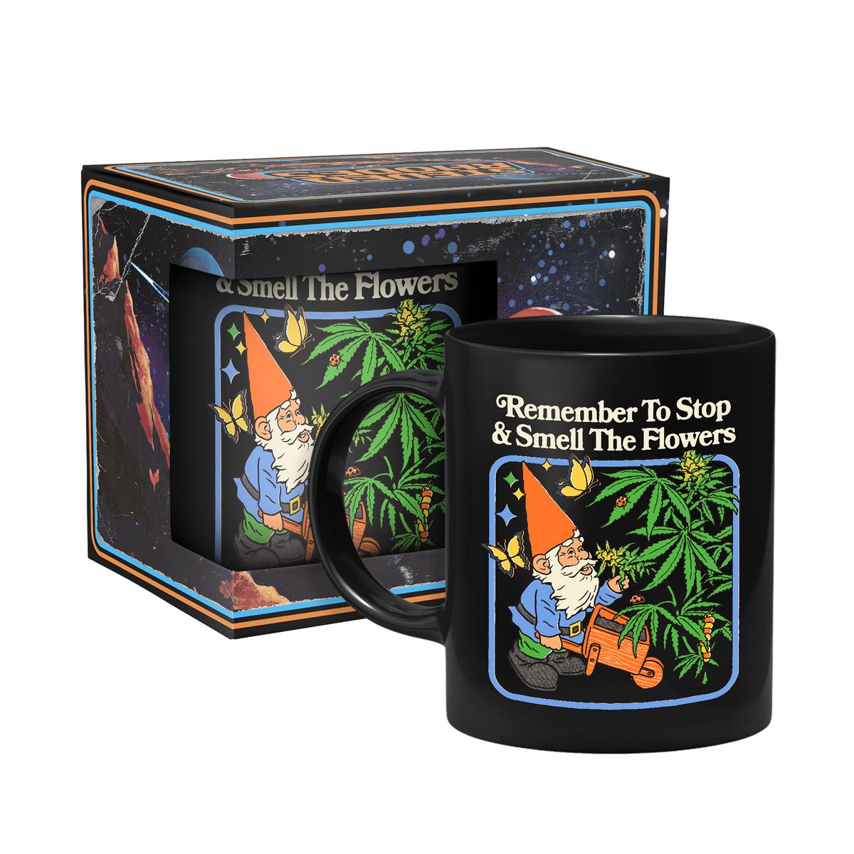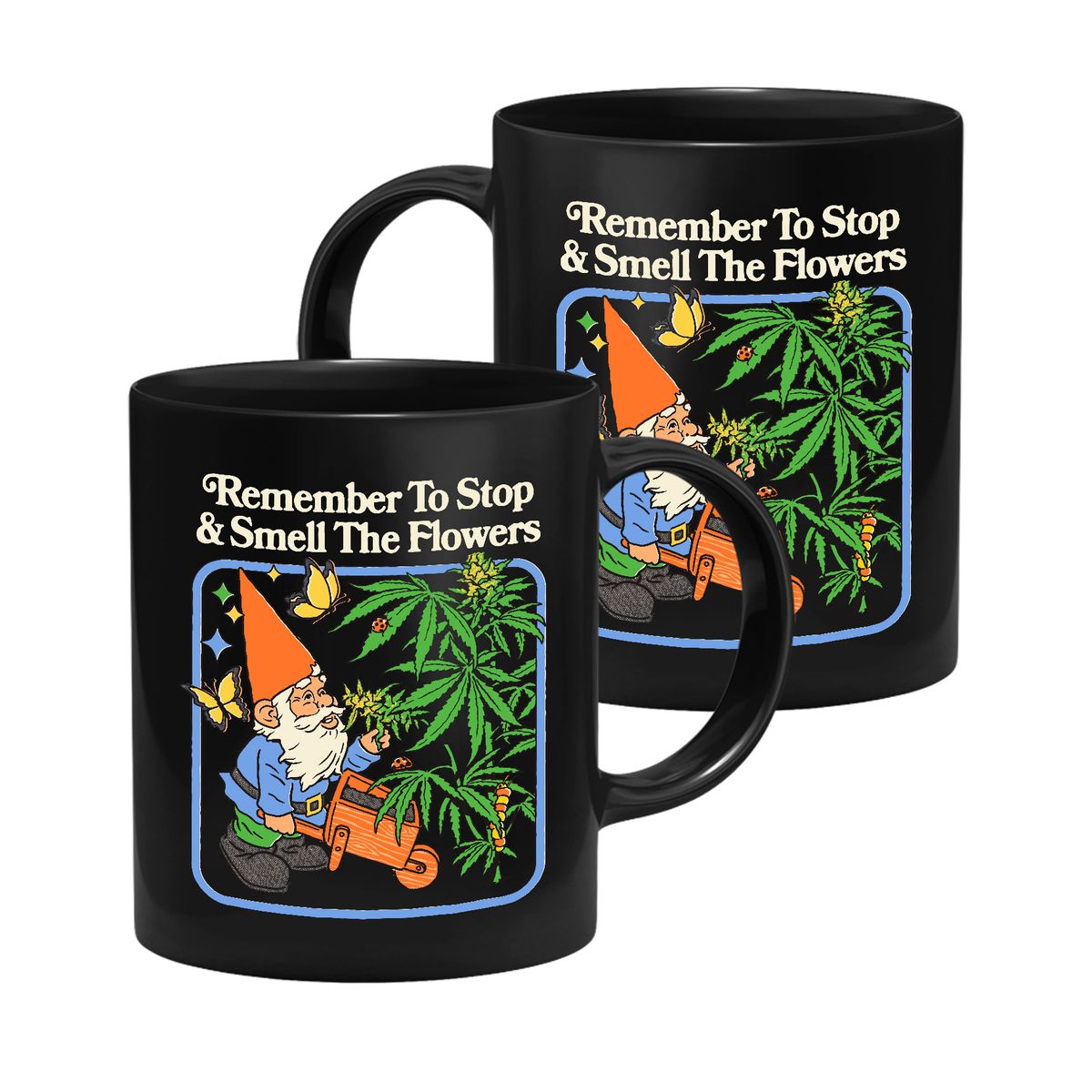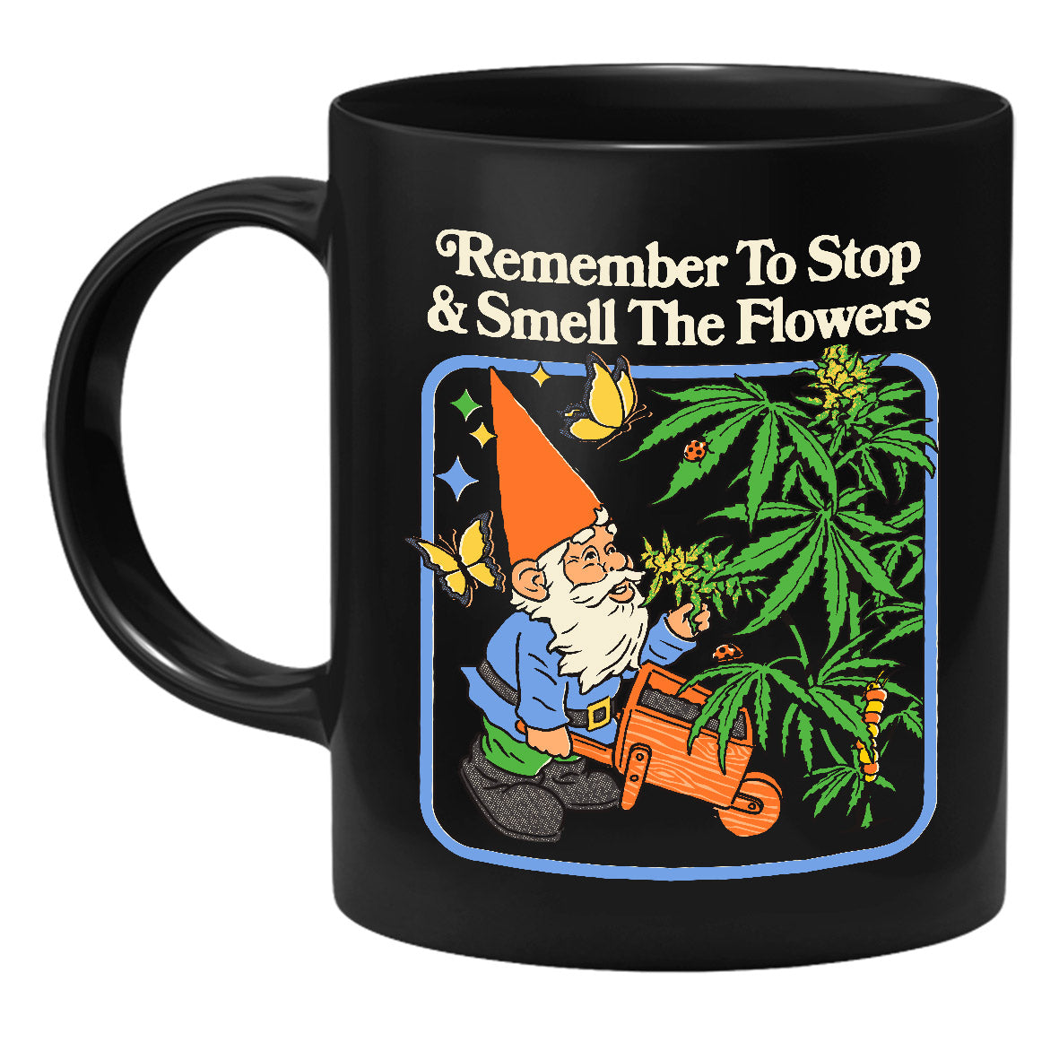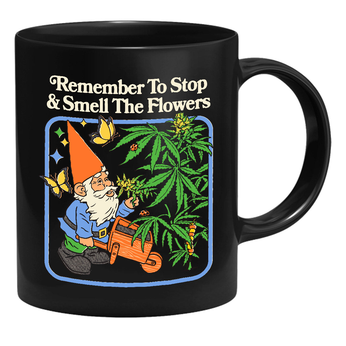 Die Tasse zeigt einen Gartenzwerg, der an einer Hanfpflanze riecht.