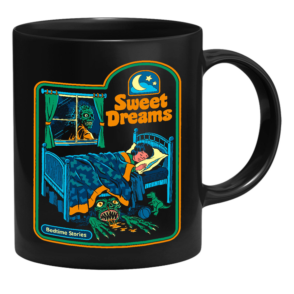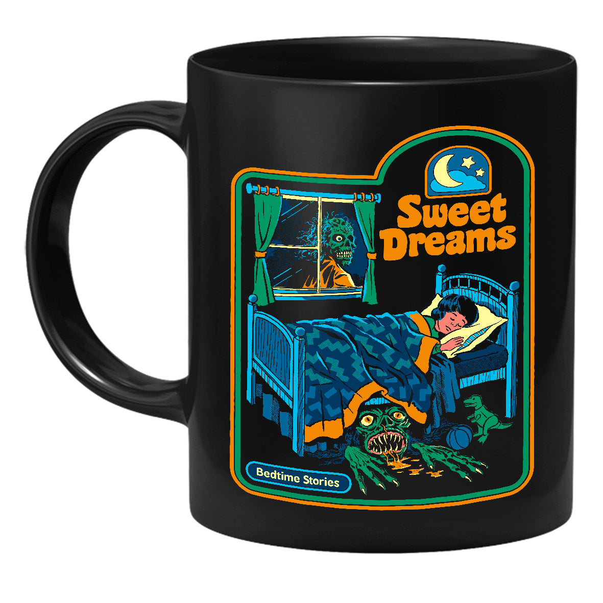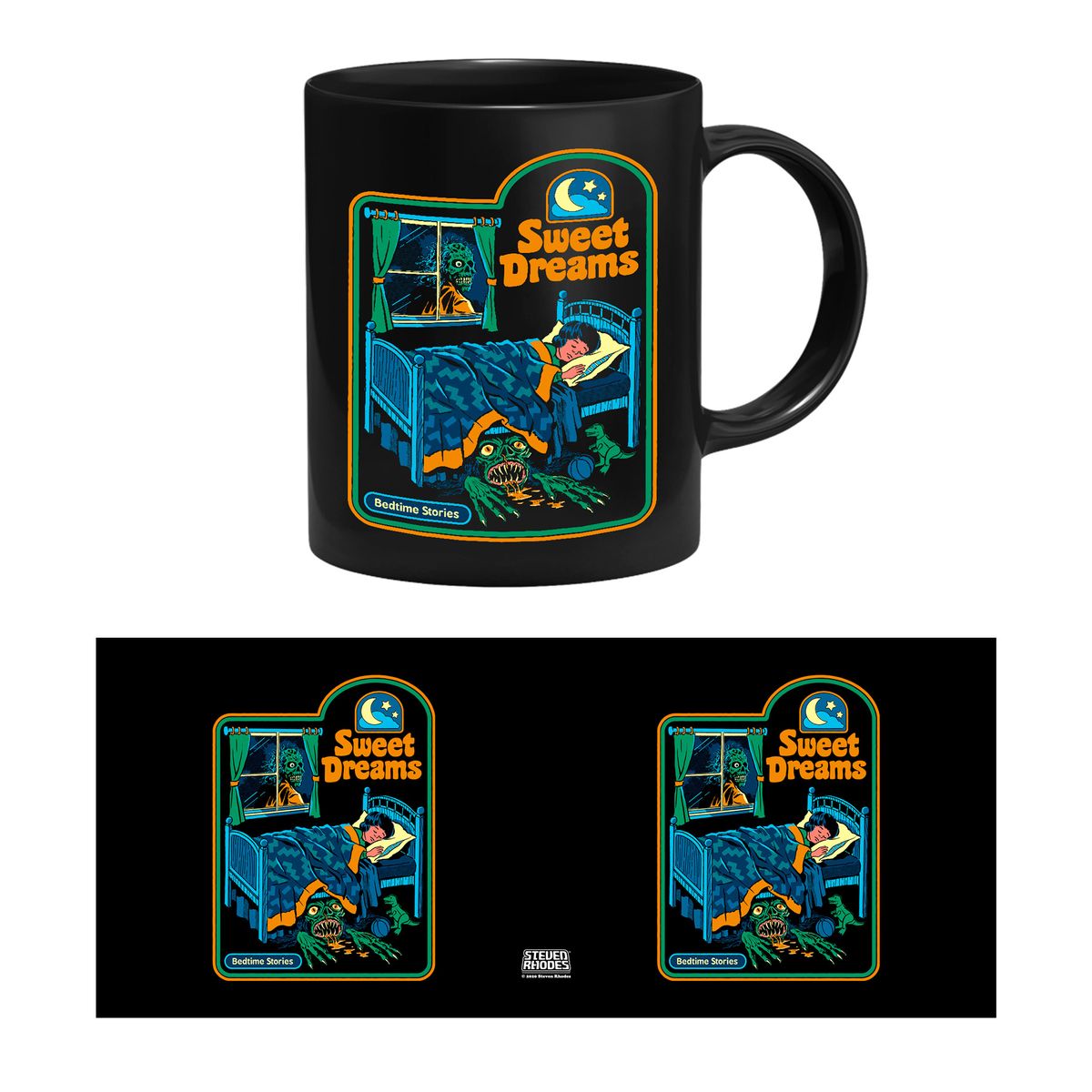Die Tasse zeigt einen Jungen, der friedlich schläft, während Monster vor seinem Fenster und unter seinem Bett lauern.