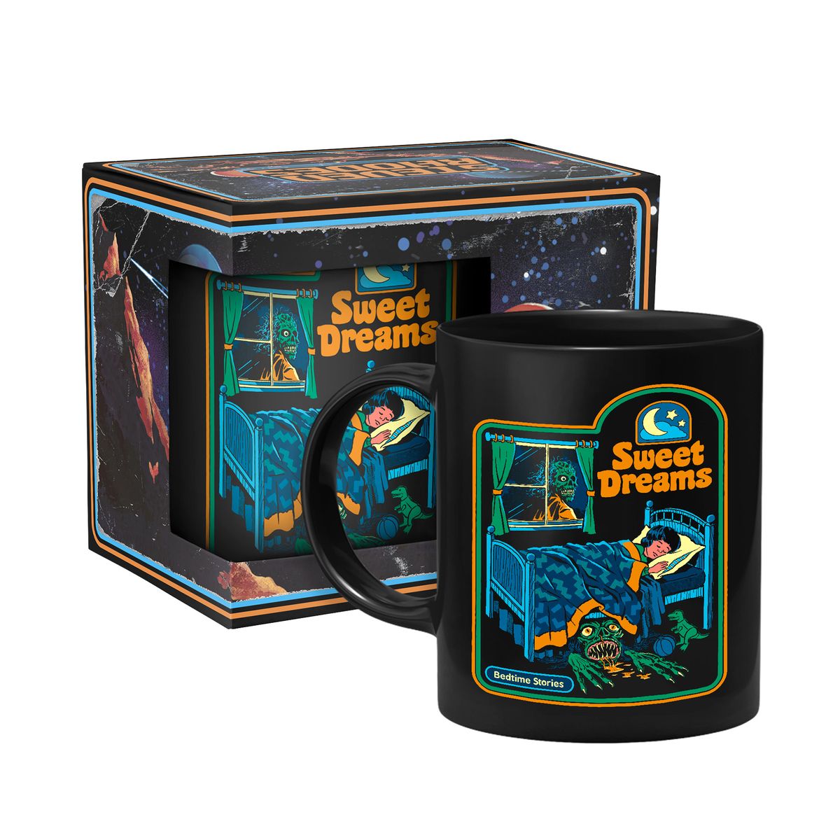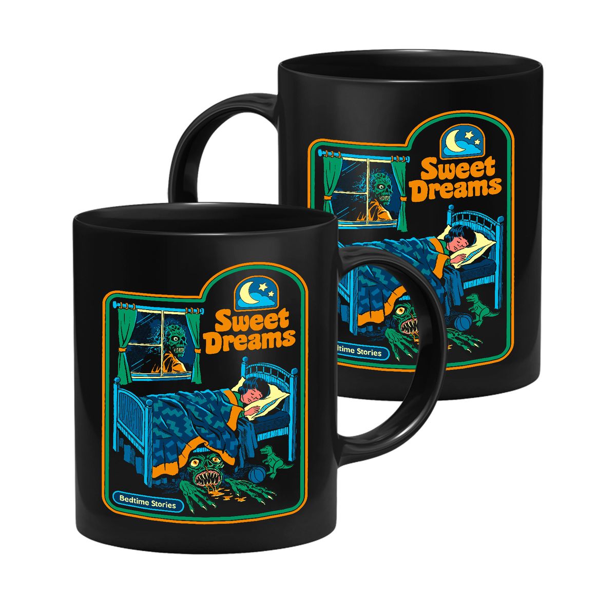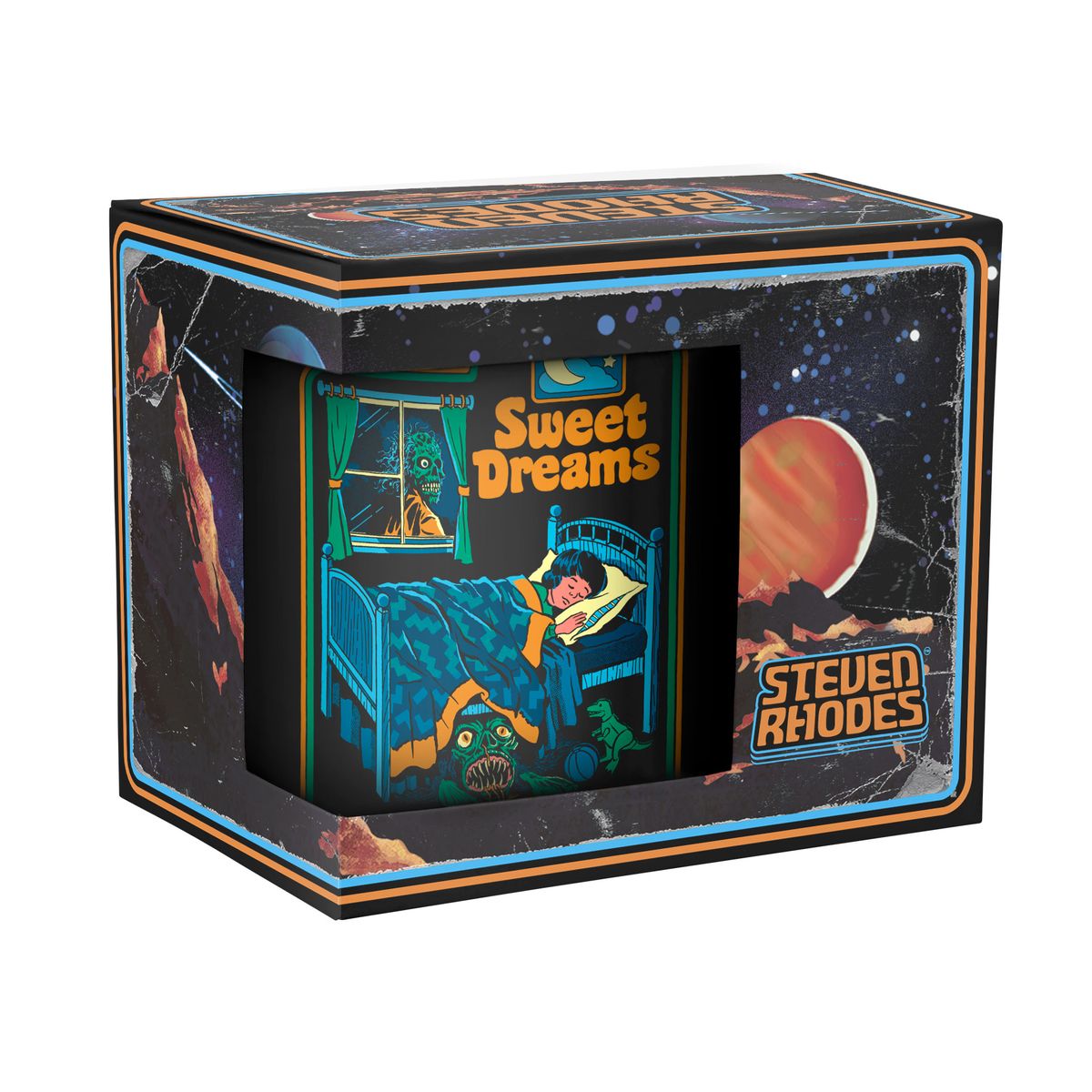 Die Tasse zeigt einen Jungen, der friedlich schläft, während Monster vor seinem Fenster und unter seinem Bett lauern.