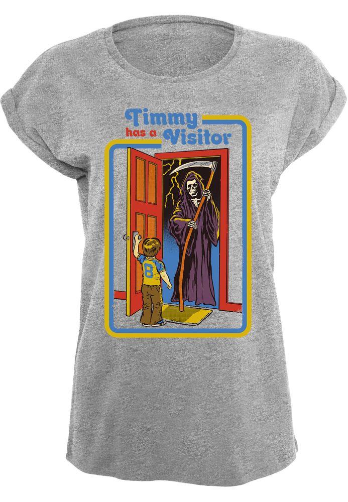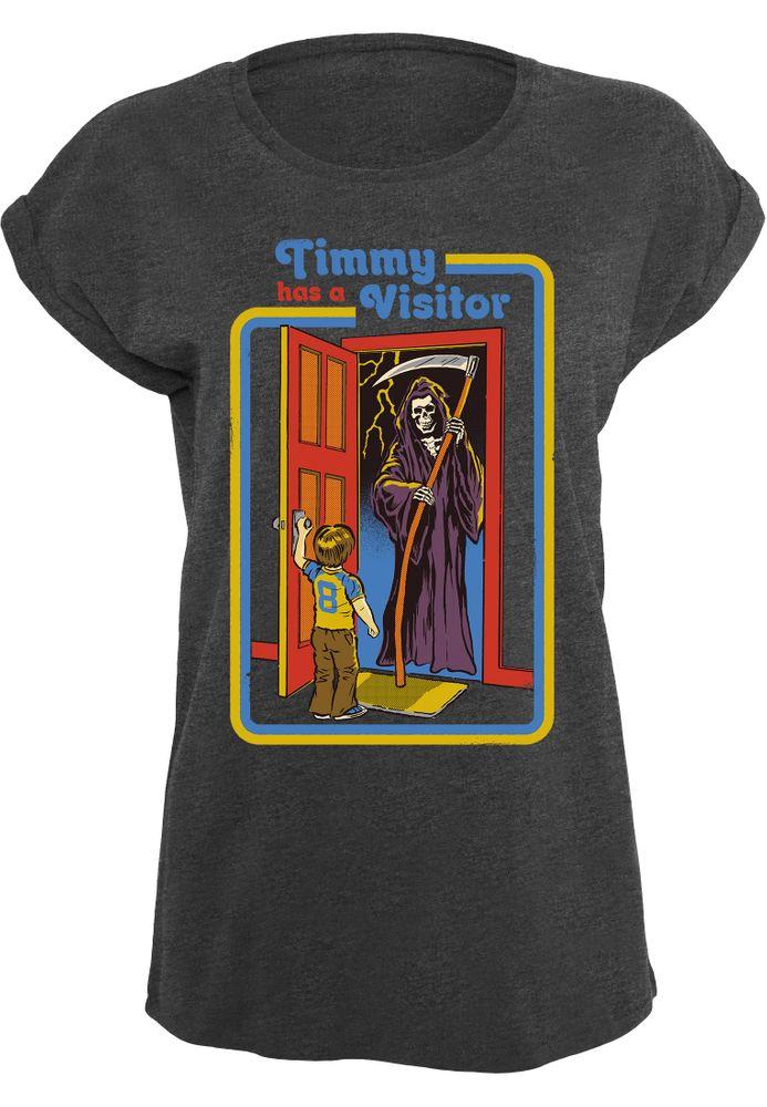 Das Girlshirt zeigt einen Jungen, der gerade dem Tod in Form des Sensenmannes, die Tür geöffnet hat und den Text "Timmy Has A Visitor".