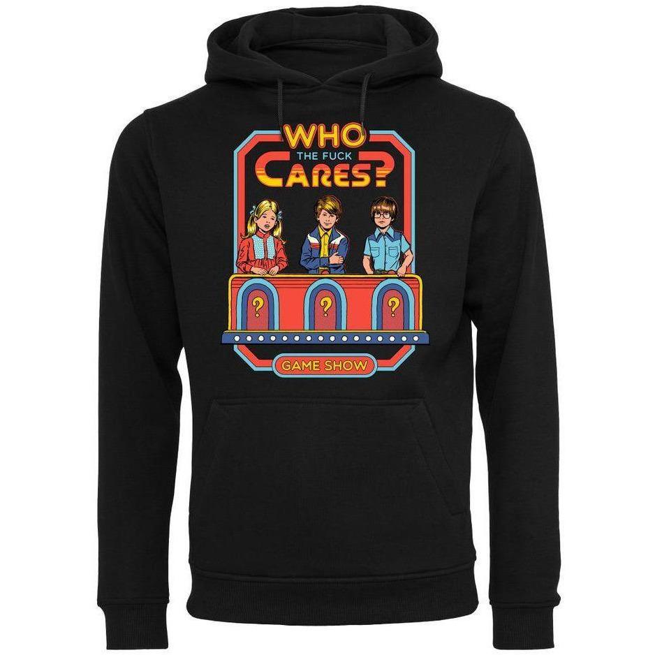 Der Sweater zeigt drei Kinder, die Kandidaten in einer Gameshow sind. Über ihnen steht "Who The Fuck Cares?".