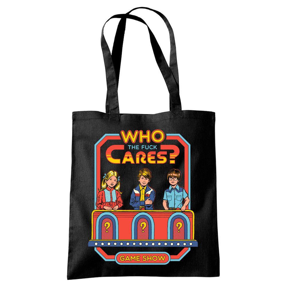 Die Tasche zeigt drei Kinder, die Kandidaten in einer Gameshow sind. Über ihnen steht "Who The Fuck Cares?".
