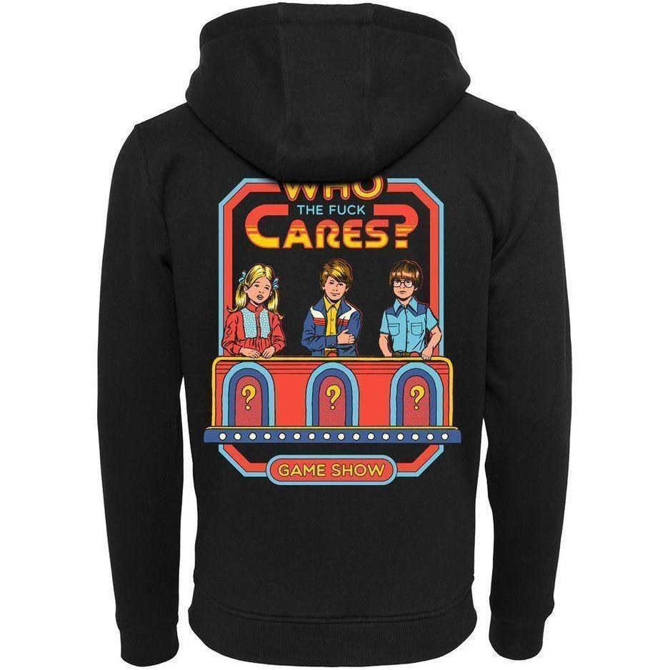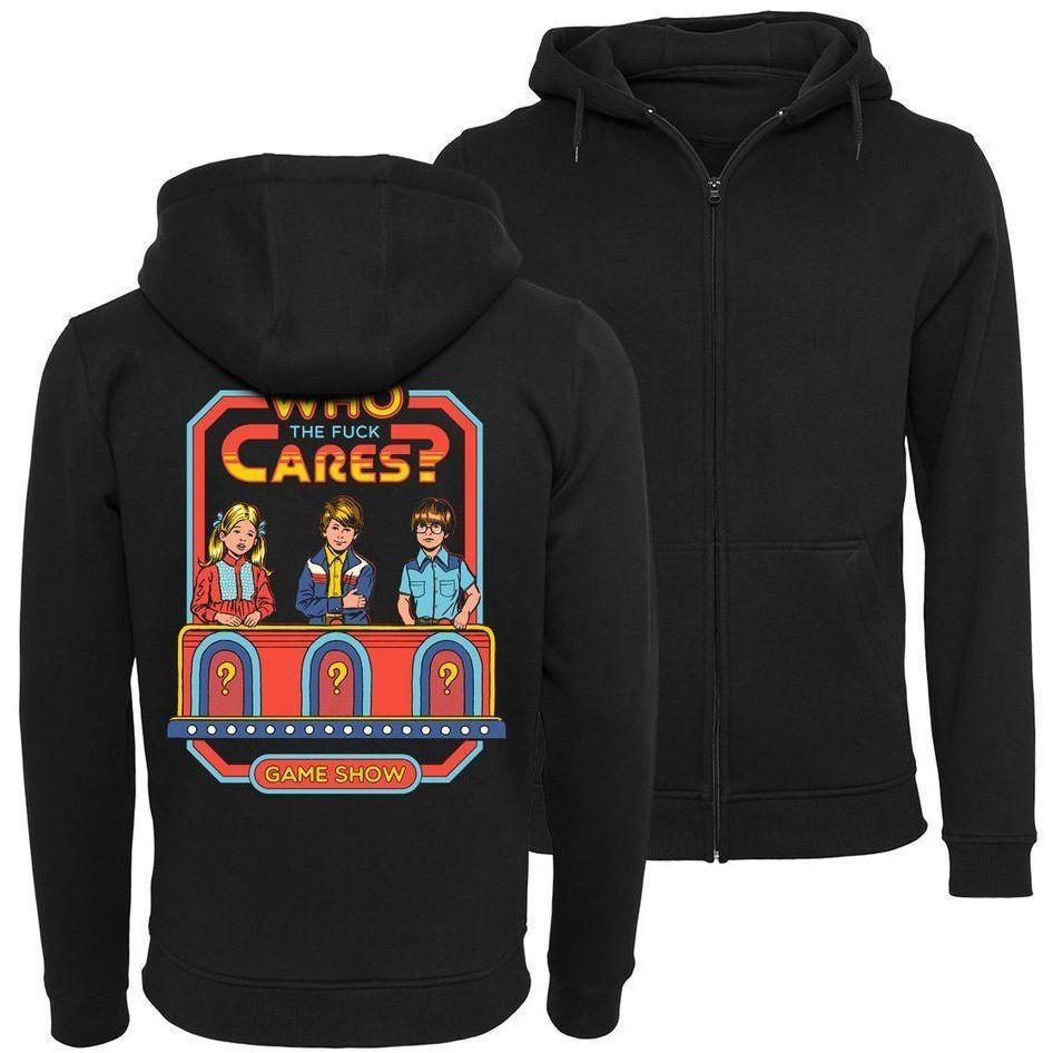 Der Zip-Hoodie zeigt drei Kinder, die Kandidaten in einer Gameshow sind. Über ihnen steht "Who The Fuck Cares?".