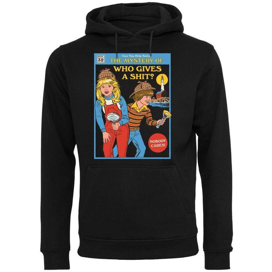 Der Hoodie zeigt zwei Kinder, die als Detektive verkleidet sind. Im Hintergrund erkennt man einen Leuchtturm. Oben steht "Can You Help Solve The Mystery Of Who Gives A Shit?".