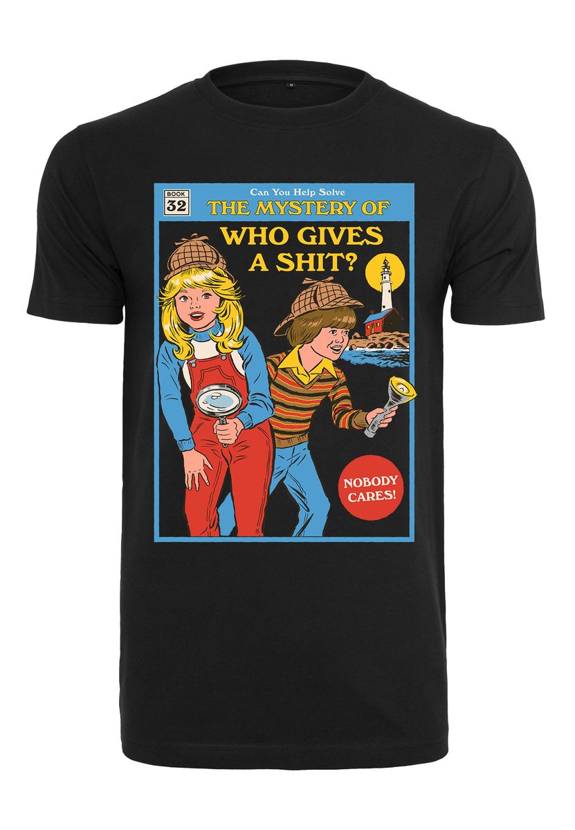 Das T-Shirt zeigt zwei Kinder, die als Detektive verkleidet sind. Im Hintergrund erkennt man einen Leuchtturm. Oben steht "Can You Help Solve The Mystery Of Who Gives A Shit?".