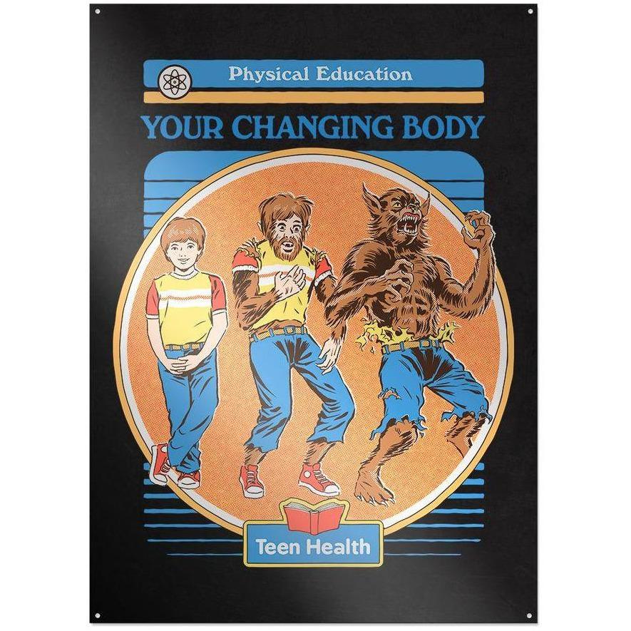 Das Metallschild zeigt einen Jungen, der sich in einen Werwolf verwandelt. Darüber steht der Satz "Your Changing Body".