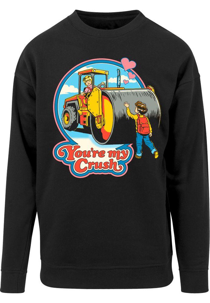 Der Sweater zeigt ein Mädchen, das auf einer Dampfwalze sitzt. Vor ihr steht ein Junge, der ihr zuwinkt.