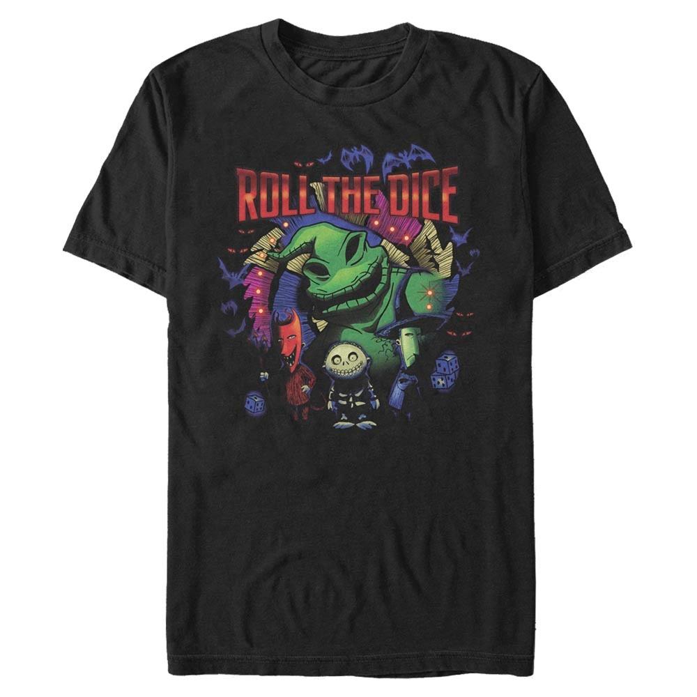 Das T-Shirt zeigt Oogie Boogie mit seinen Helfern Schrecken, Angst und Furcht. Darüber steht "Roll The Dice".