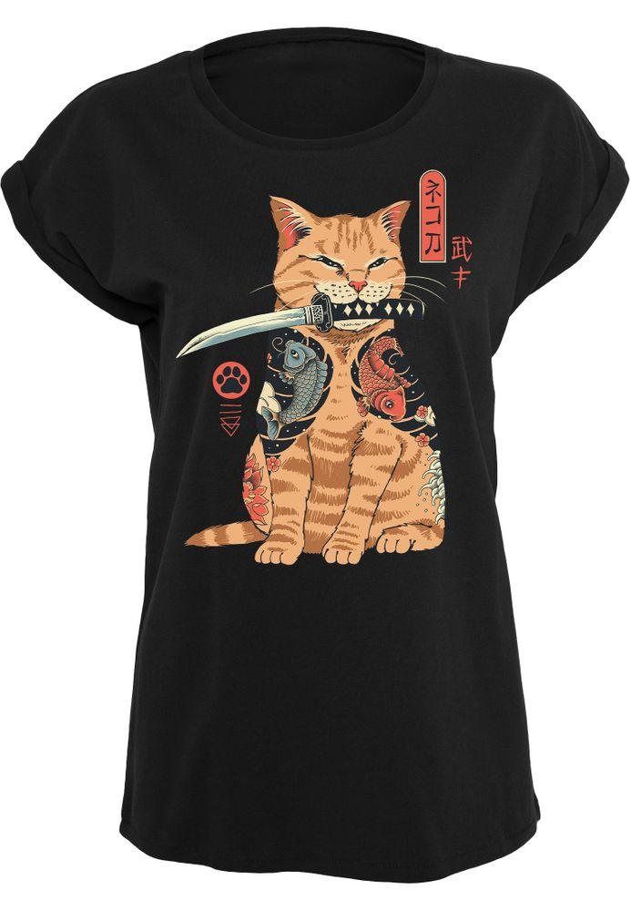 Das Shirt zeigt eine Katze mit einem Katana in der Schnauze.