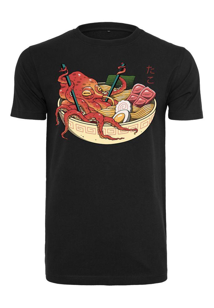 Das Shirt zeigt einen Oktopus, der in einer Schale Ramen chillt.