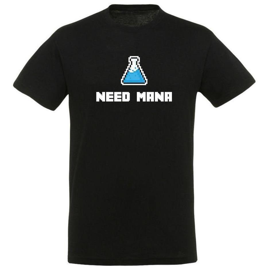 Schwarzes T-Shirt mit einem blauen Fläschchen. Drunter steht in pixeliger Schrift "Need Mana".